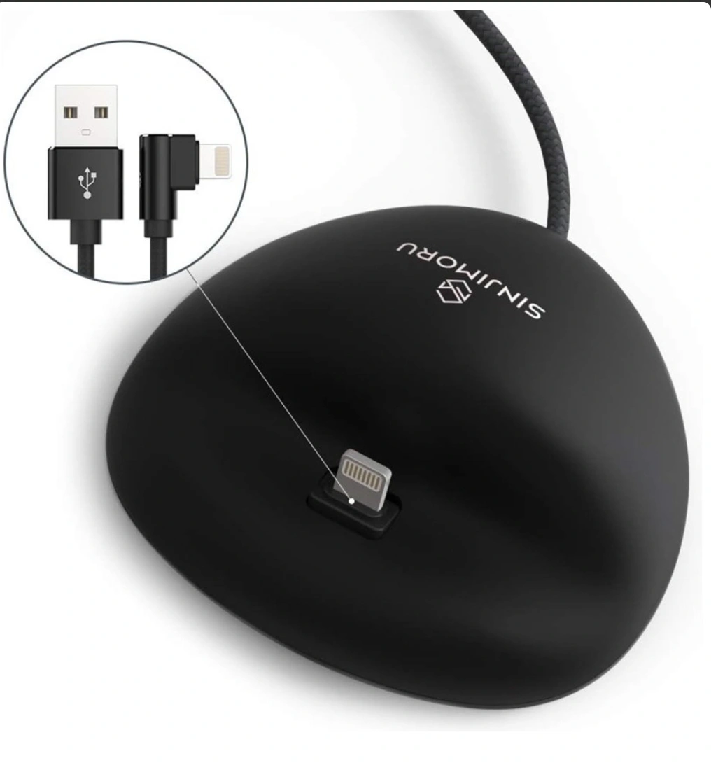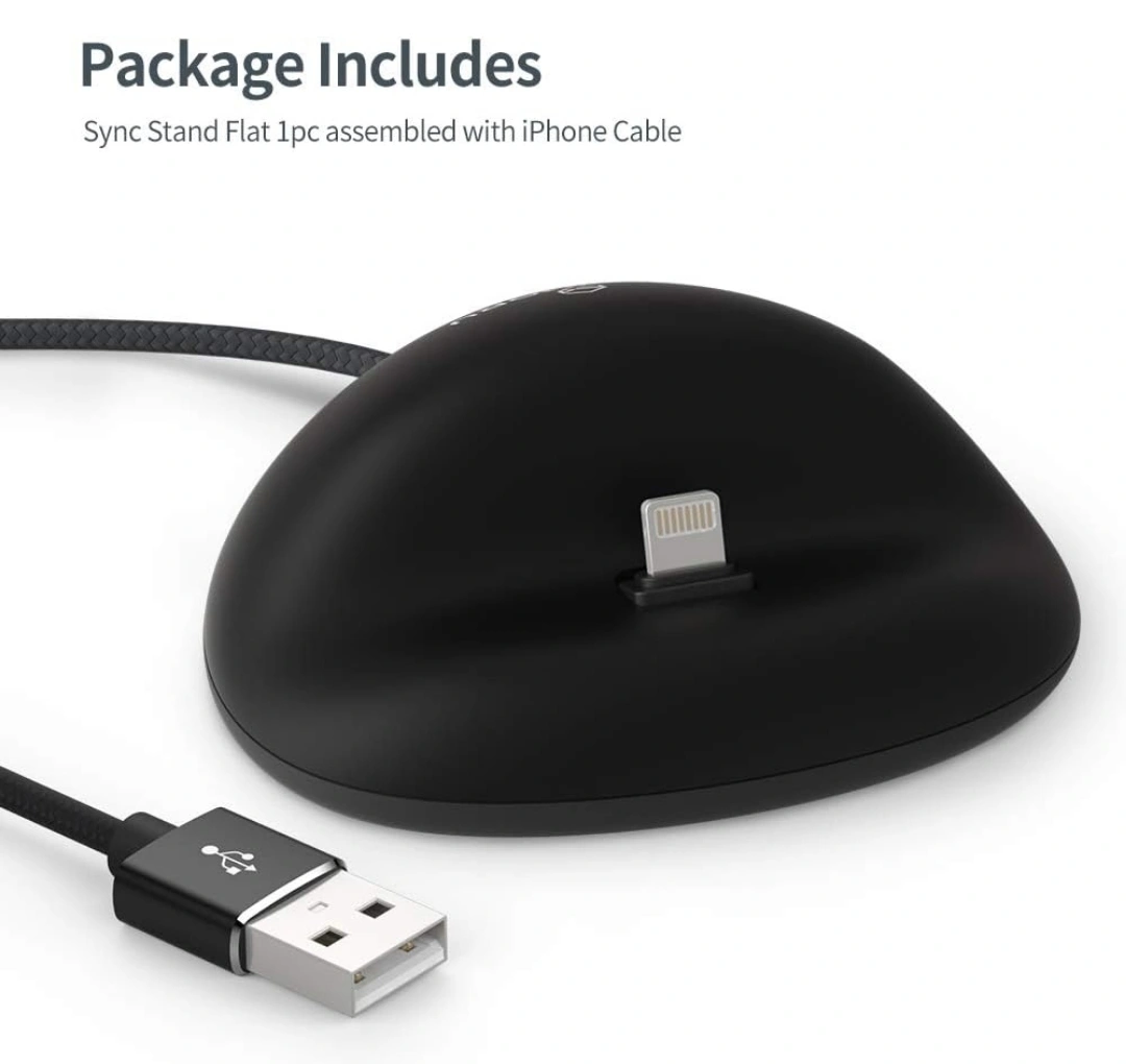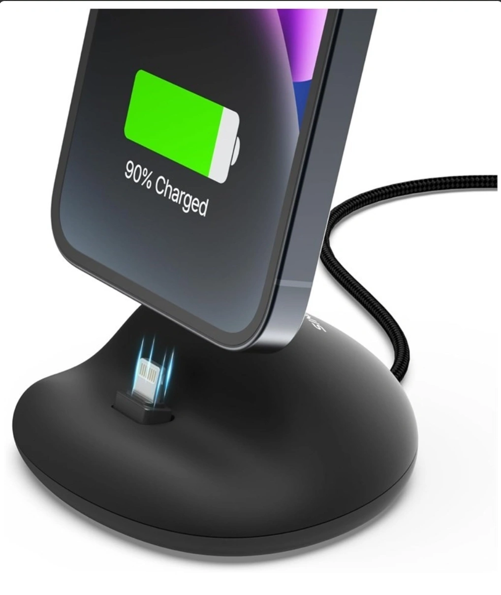 Compact and convenient phone stand. Charges your iPhone while it stands. Includes USB-A to Lightning cable. Anti-slip pad keeps your device secure. Easy one-handed mounting.