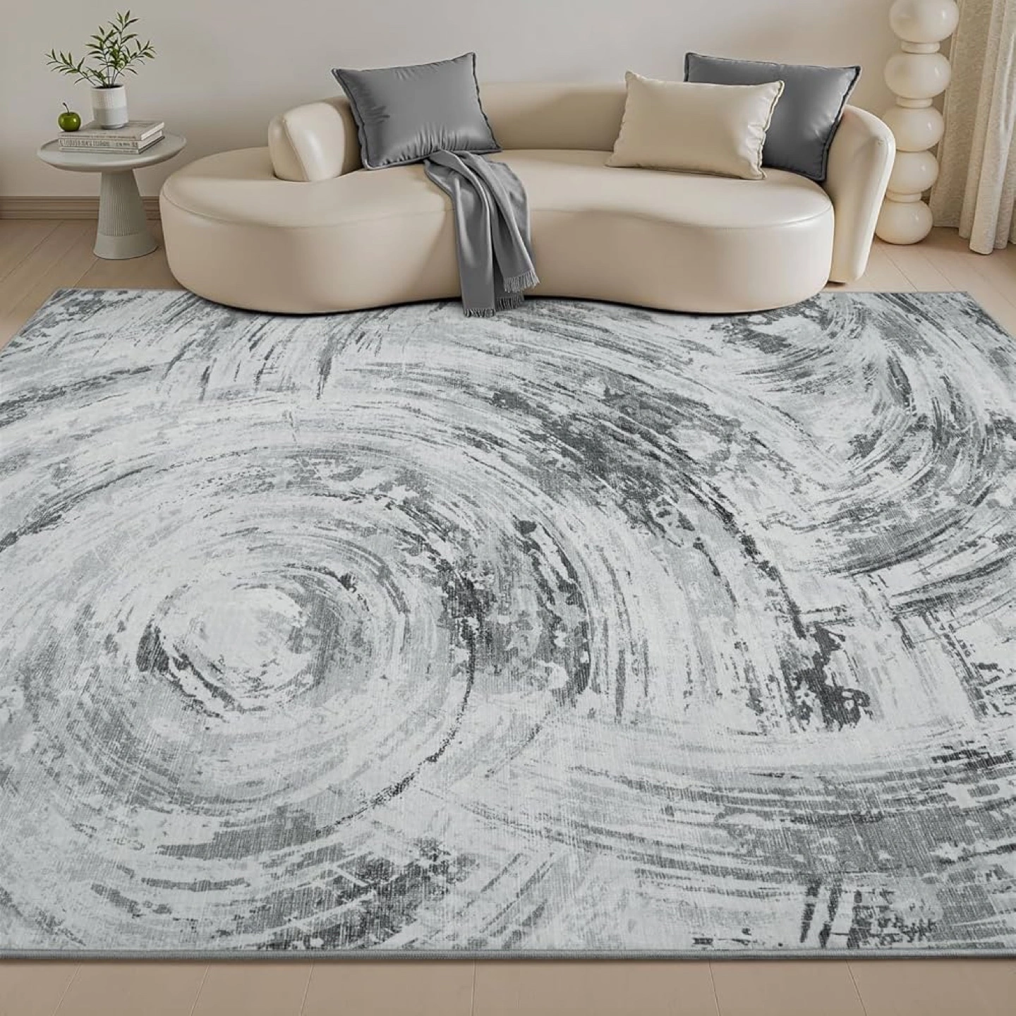 Stylish area rug. Grey and white abstract design. Soft and comfortable underfoot. Perfect for living room or bedroom. Machine washable. Durable and easy to clean. Pick up is in Ajax, close to harwood bayly intersection. Delivery may be available based on location.