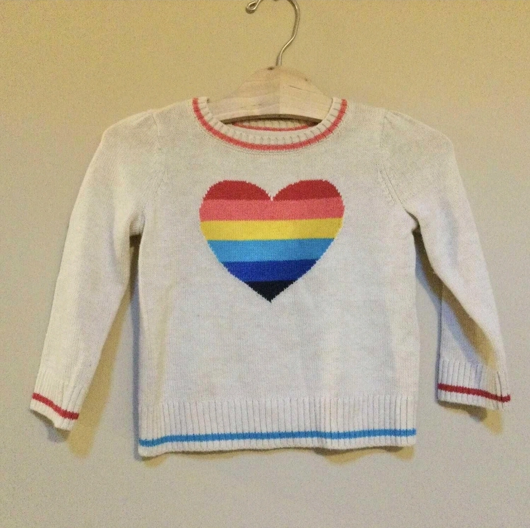 Cream-coloured long-sleeve sweater. Features a rainbow heart design. Knit material. Gap 2T Excellent used condition Worn a couple of times. Perfect for Valentine’s Day. ♥️ Pick up in Stouffville or Markham. Cross listed. Fastest pick up preferred. No holds.