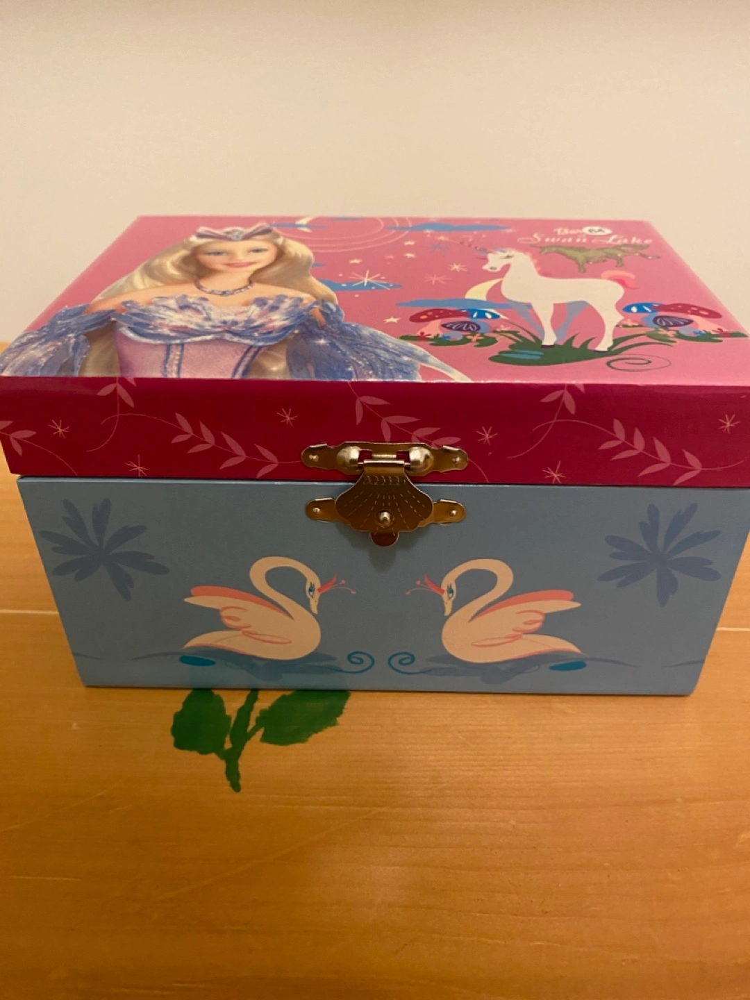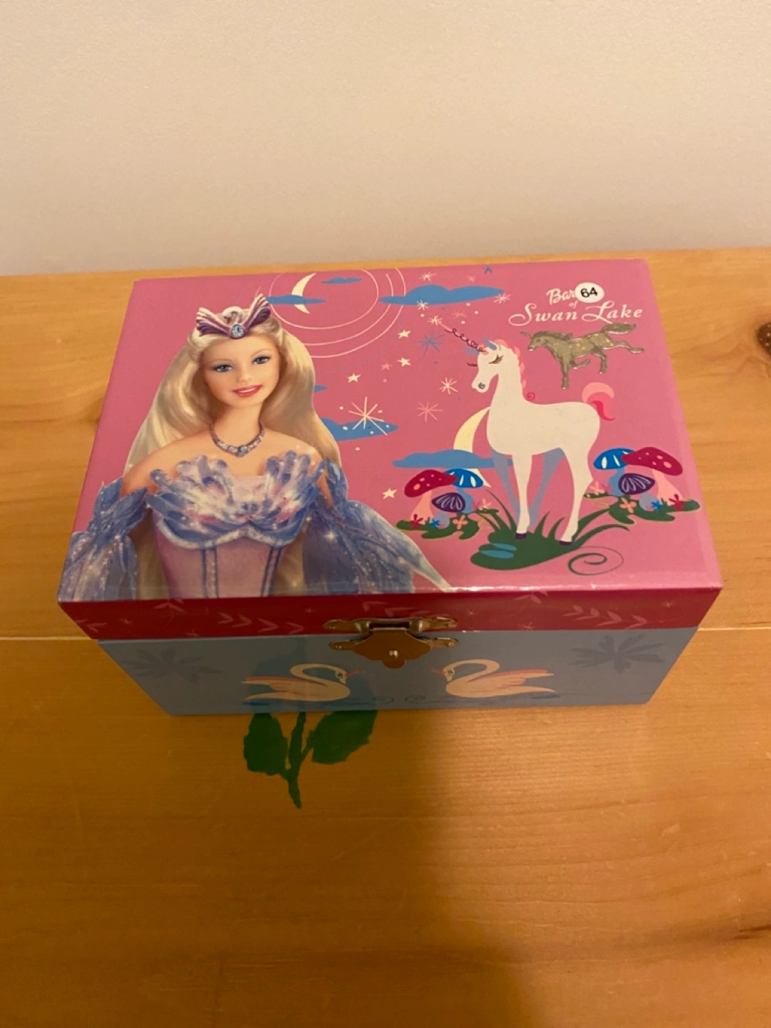 Adorable musical jewellery box. Features Barbie as Odette from Swan Lake. Pink and light blue colour scheme. Gold clasp. Approximately 13cm x 15cm.
