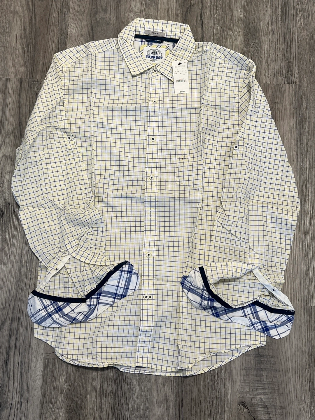 Cream and blue plaid long sleeve button down. Fitted. Has contrast inner cuffs. New with tags