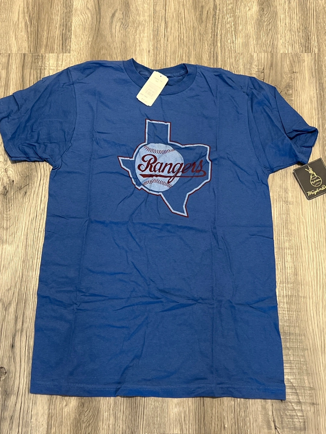 Men's short sleeve t-shirt. Features a Texas-shaped graphic with a baseball and Rangers logo. Royal blue colour. New with tags. Size medium