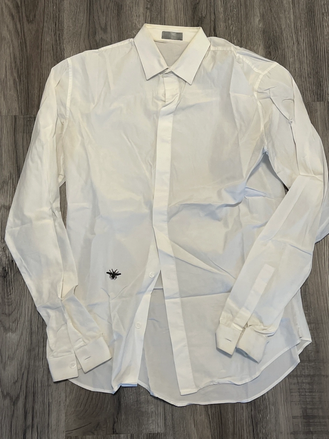 Men's long-sleeve button-down shirt. White cotton. Features a small embroidered bee on the chest. Classic fit. Size small