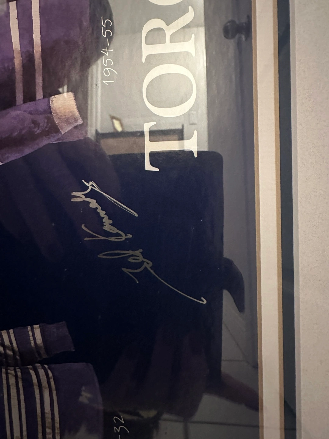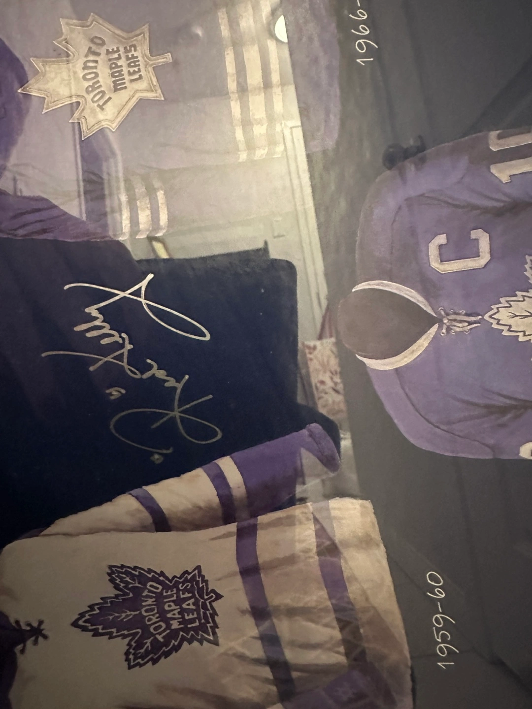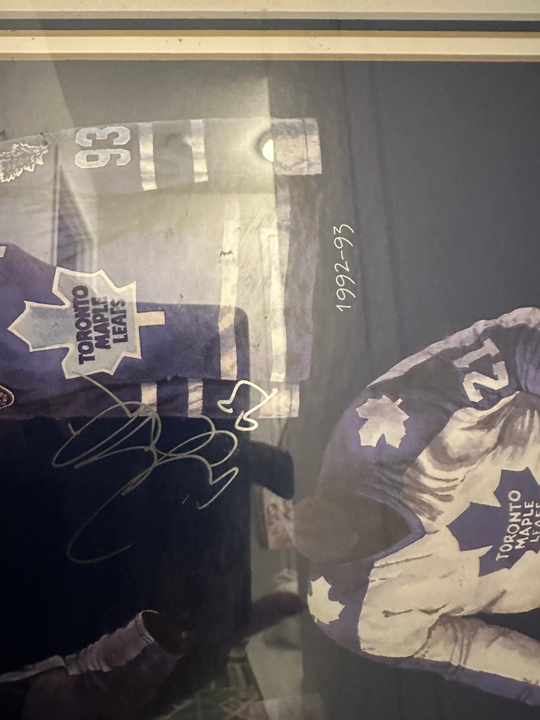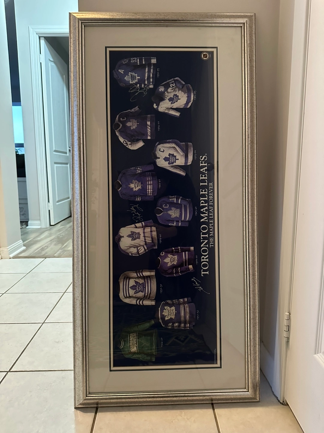 Large framed print showcasing the evolution of Toronto Maple Leafs jerseys. Features 3 signatures. Years 1959-60, 1966, 1992-93, and 1954-55 are visible. Silver frame. A great piece of Leafs memorabilia! Approximately 45x21 inches