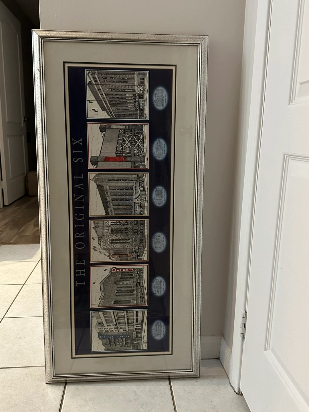 Silver framed print featuring images of The Original Six NHL arenas. Nice piece of history for a hockey fan! Approximately 42x20 inches