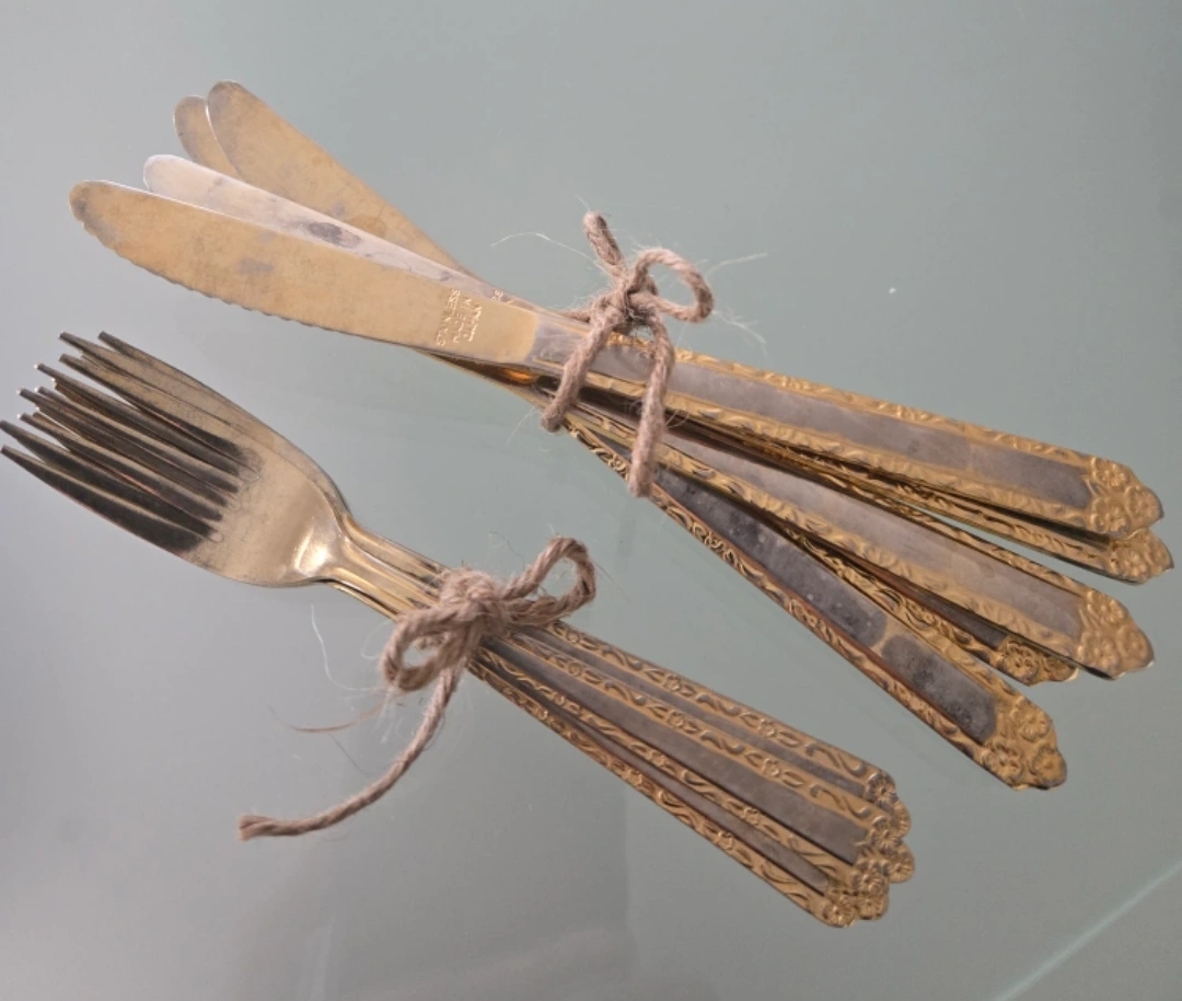 Set of 5 vintage gold-tone flatware. Includes knives and forks. Ornate detailing. Gold color faded since it was not dishwasher safe.