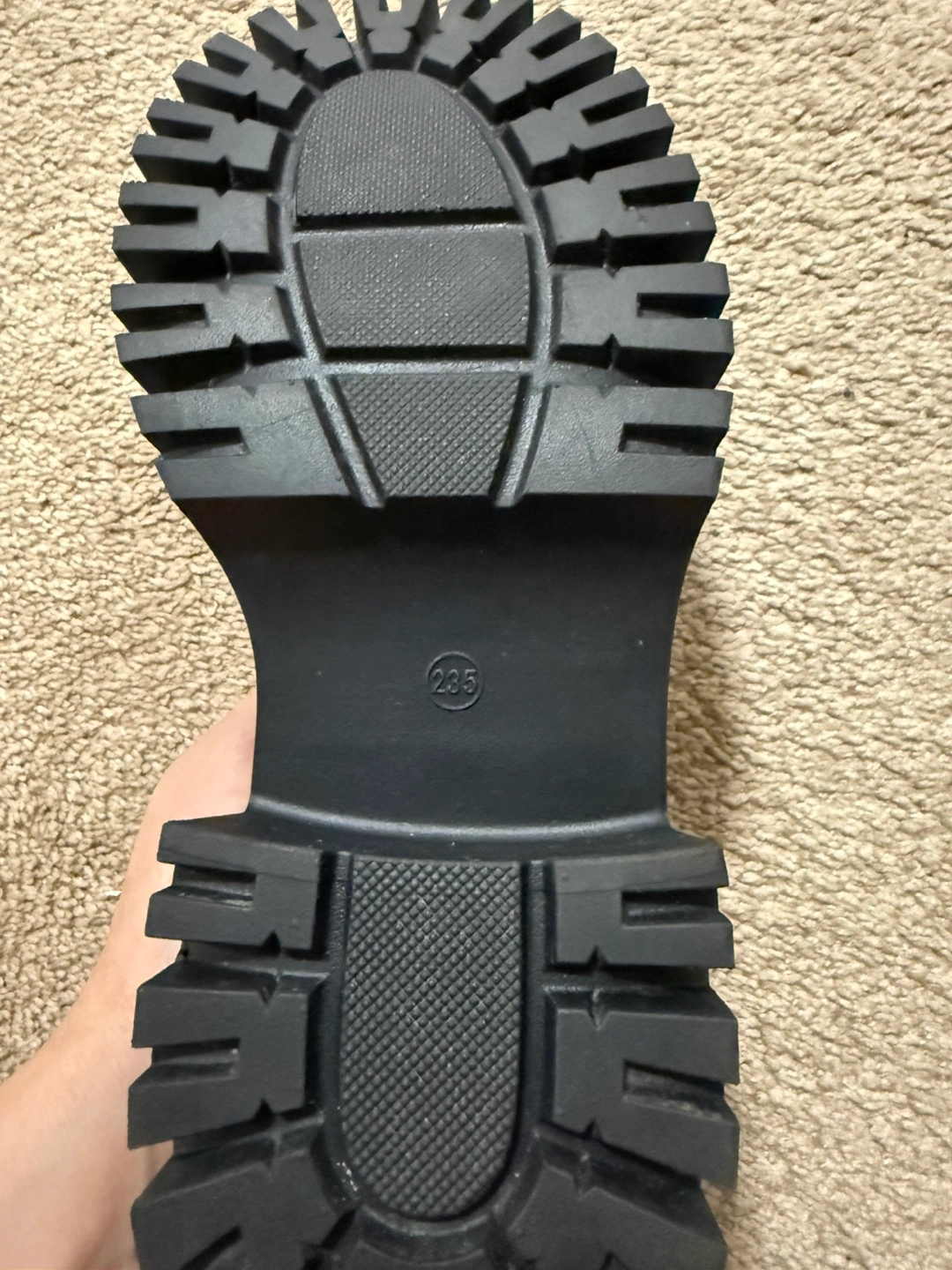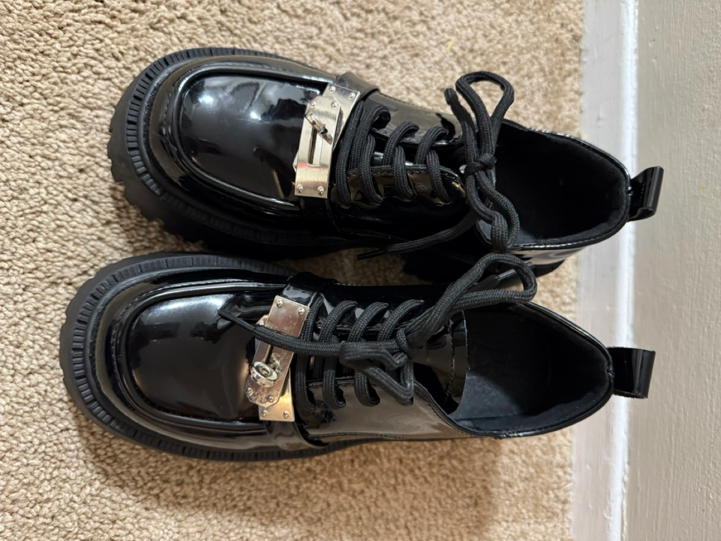 Women's black patent leather platform oxford shoes. Lace-up closure. Chunky platform sole. Silver-toned hardware accents. Size: Likely a women's 7 or 7.5 . You can try it before you take it. Pick up at Frobisher lane.