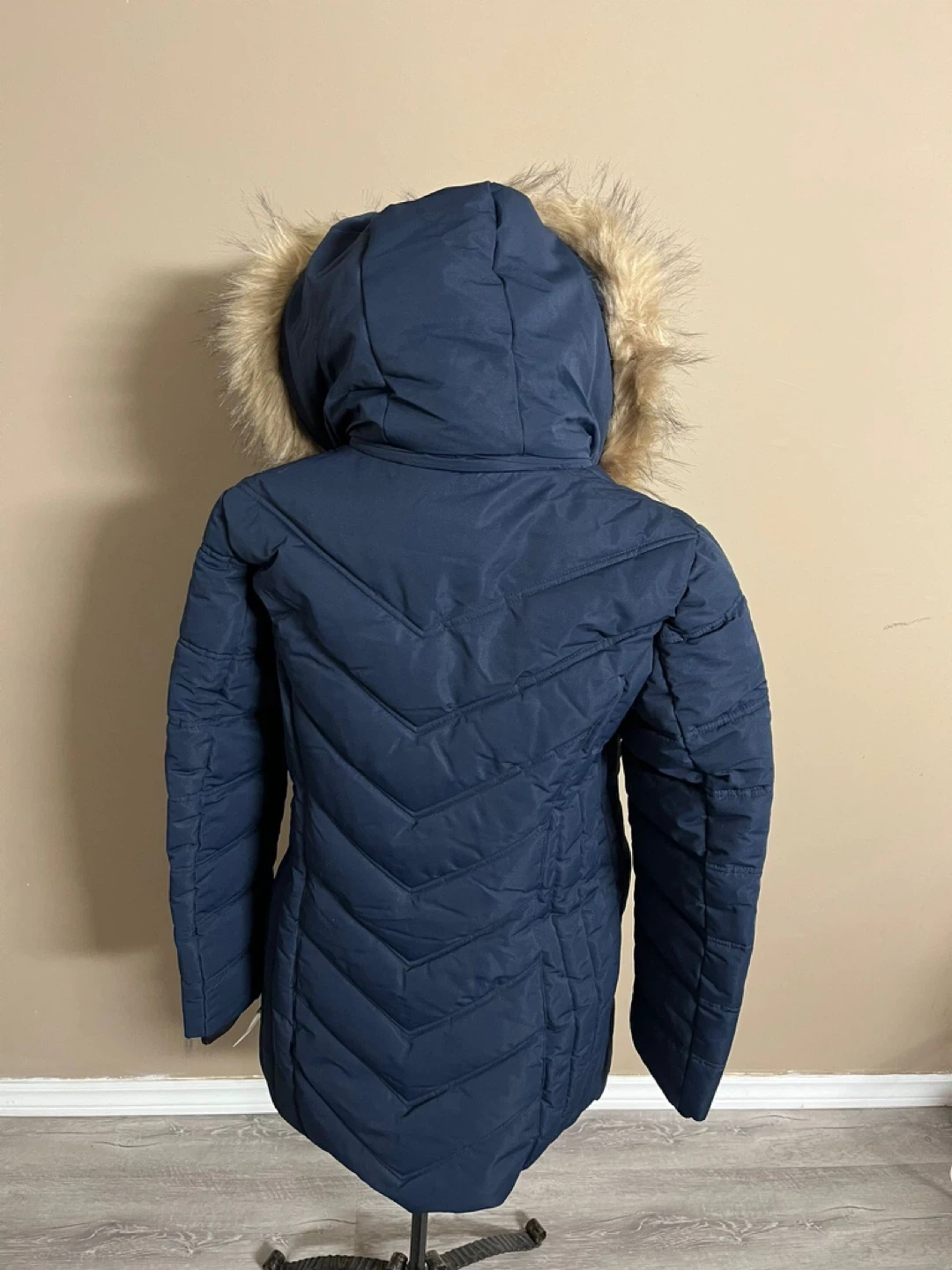 Brand new with tags Point zero winter jacket Size medium Long-length navy blue puffer jacket. Features a faux fur lined hood and zipper closure. Excellent for cold weather. Lightly quilted design.