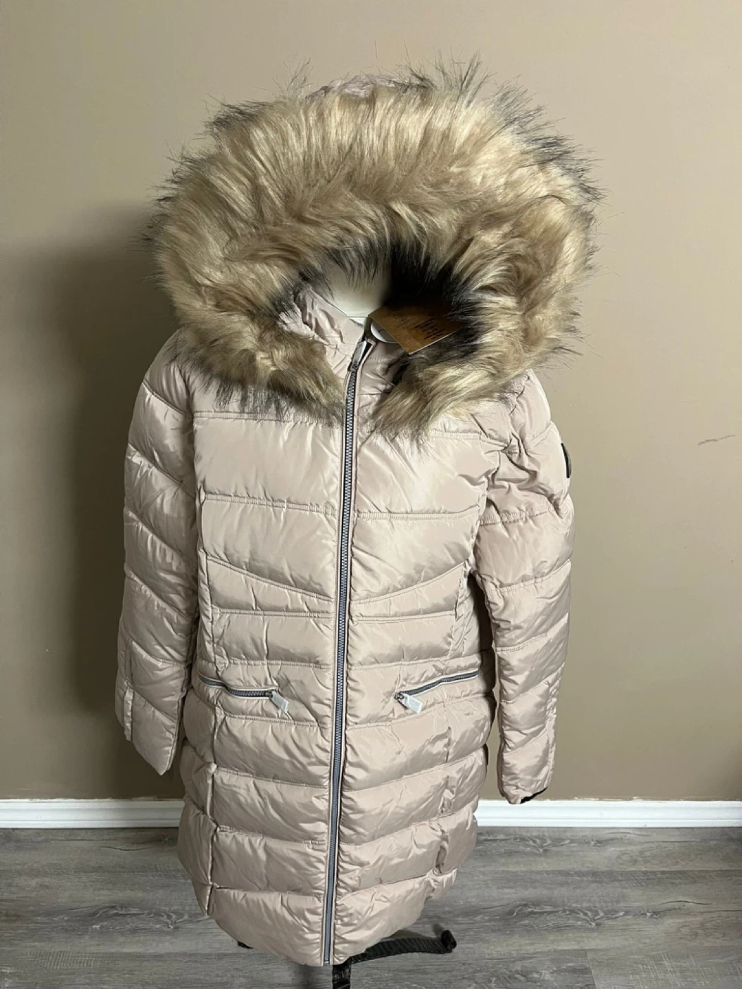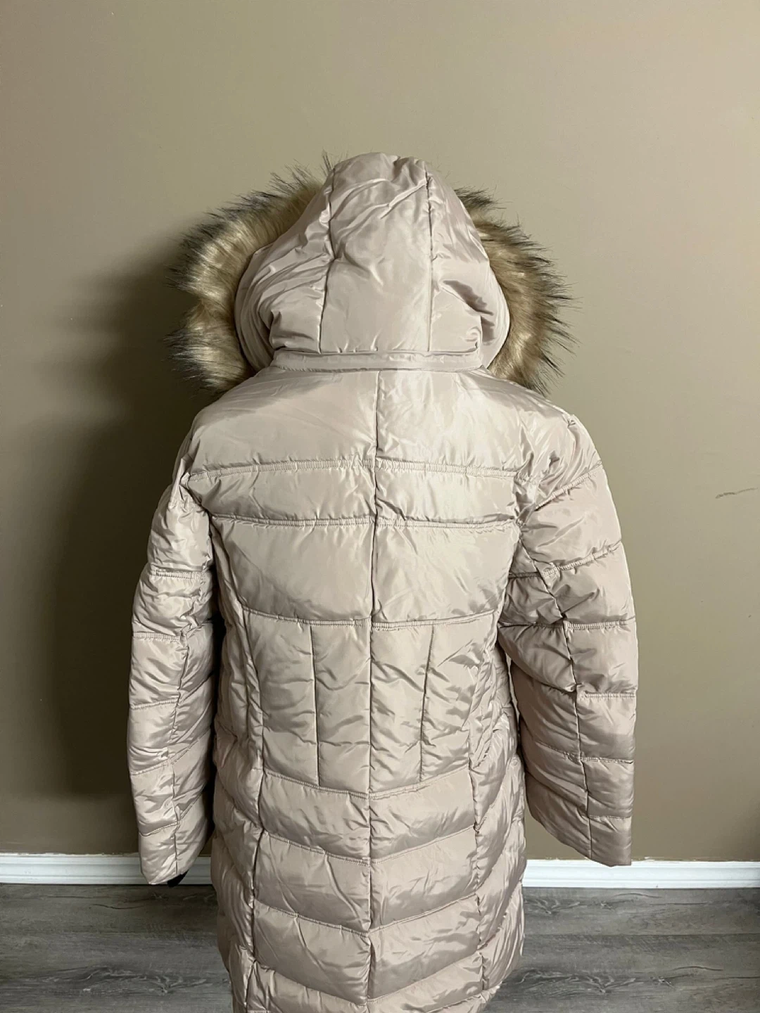 Brand new with tags Point zero winter jacket Size medium and XL Long-length puffer jacket. Beige colour. Features a faux fur lined hood. Zipper closure. Side pockets.