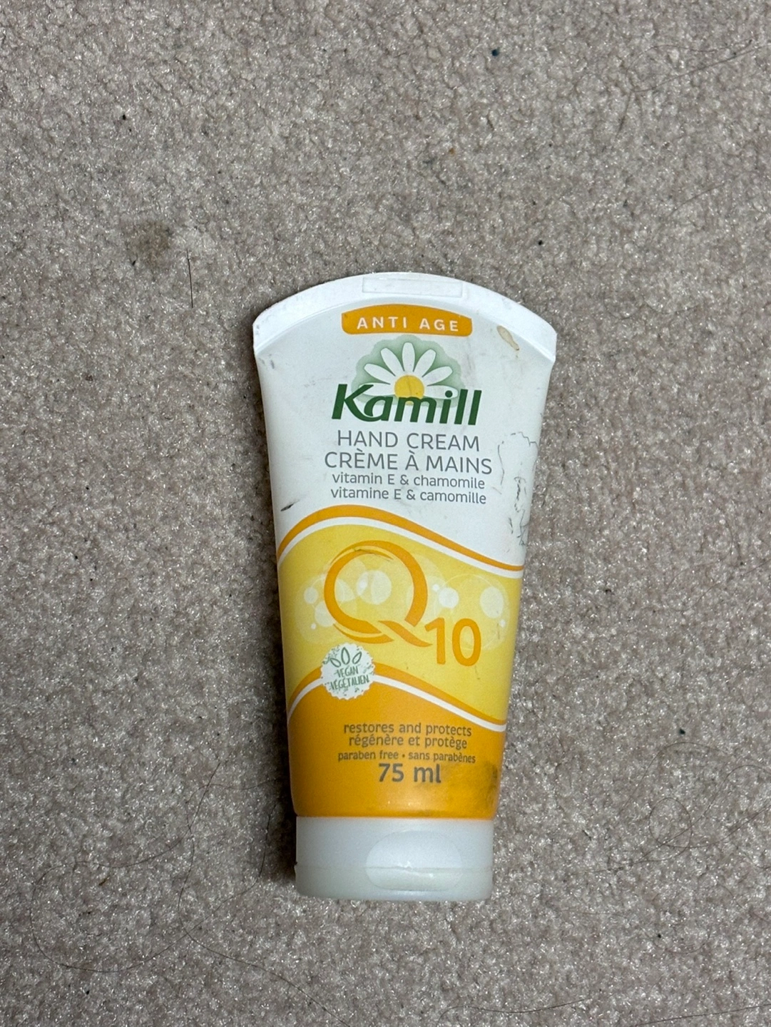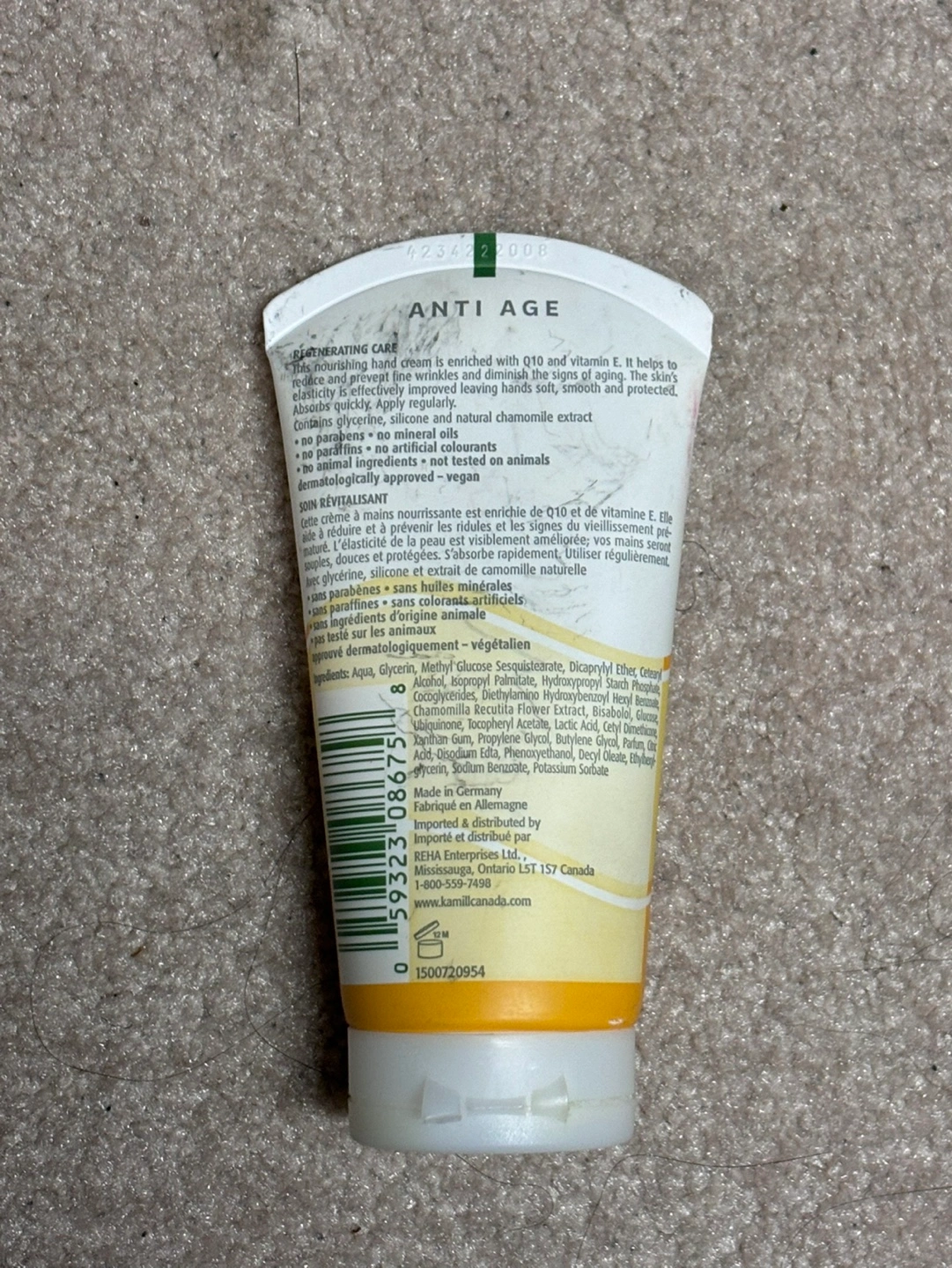 Used tube of Kamill anti-age hand cream. Contains vitamin E and chamomile. Paraben free. 75 ml.