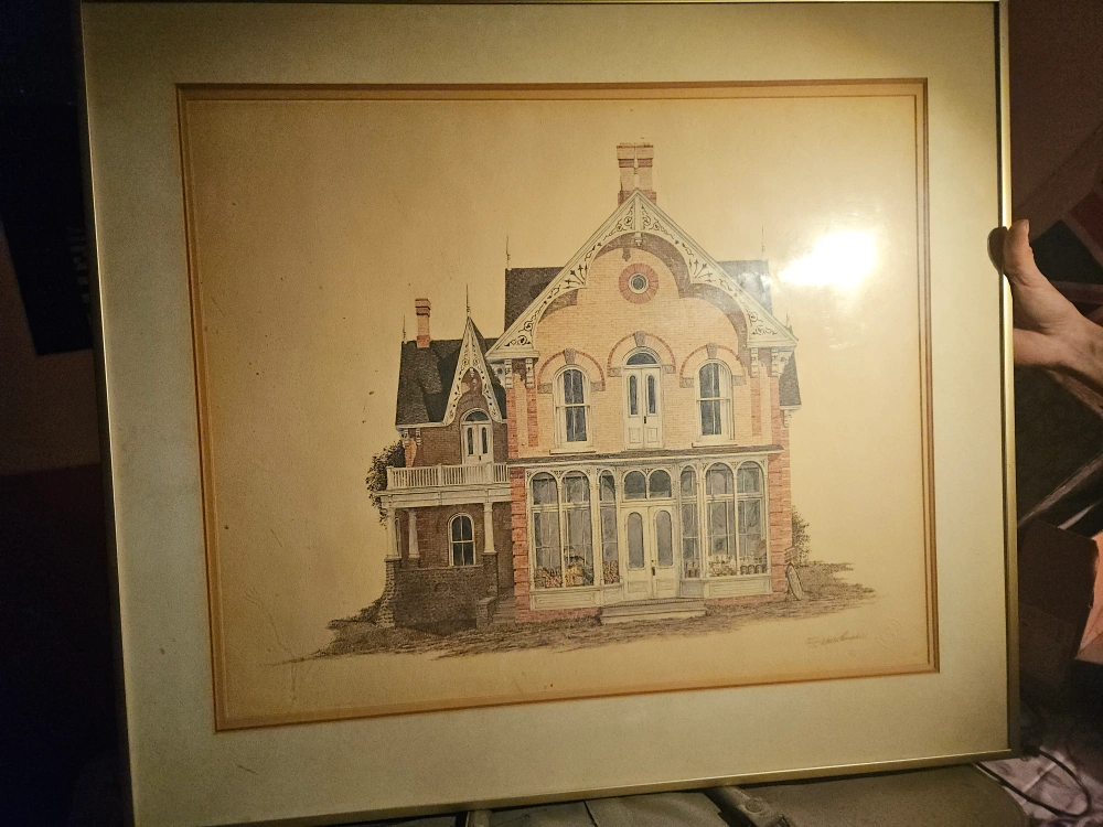 Walter Campbell hand signed and stamped Depicts a Victorian-style house. Artist signature and date visible. Nice piece for home decor.