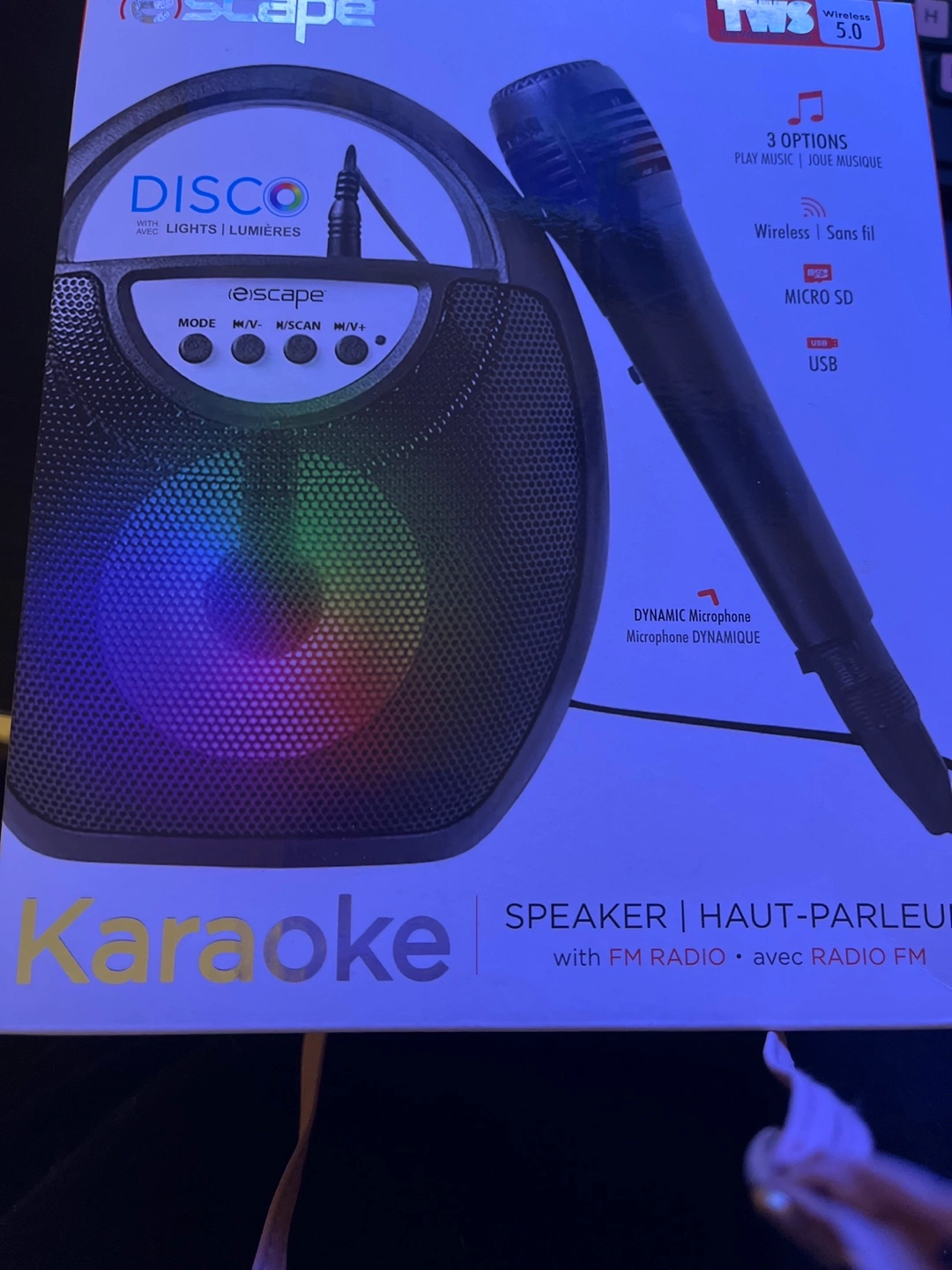 Karaoke speaker with lights. Includes wireless microphone. Features FM radio, Micro SD and USB playback options. Dynamic microphone.This is brand new never opened would make a great gift.