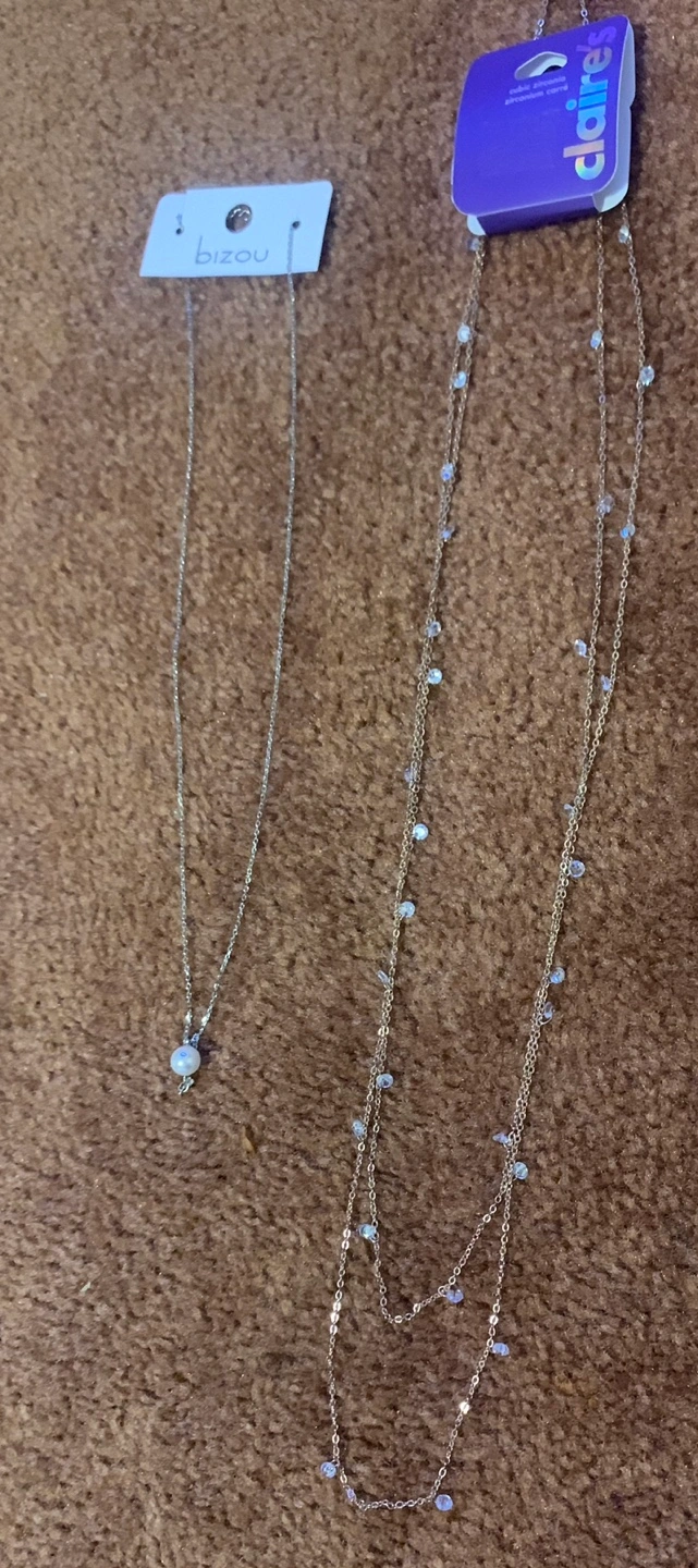 Set of two necklaces. One features a single pearl pendant on a delicate chain. The other a layered gold-tone chain with clear accents. Both are in excellent condition. New.