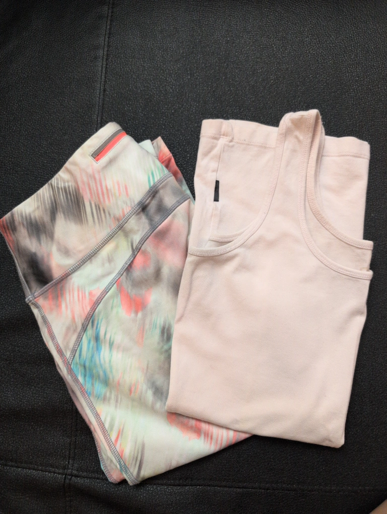 Women's athletic capris. Size medium. Colorful abstract print. Back zipper pocket. Excellent condition. Comes with free pastel pink tank top - M size Ready to be picked up at 2451 Yonge Street at Starbucks (3 blocks north of Yonge and Eglinton station) Can deliver with +$3 delivery fee.