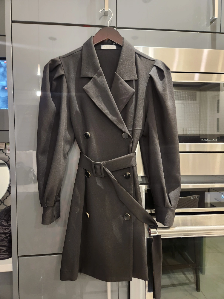 Elegant black mini suit dress. Double-breasted design. Puff sleeves. Belted waist. Made in Korea. Never worn black jacket-dress. High quality, made in Korea. Unique design. Trench coat - like, suit dress playsuit dress jacket, comes with detachable belt. Fits xs-small. Shoulder 36cm. Puff shoulders. Length ~88cm. No smoking no pet home. Pick up in Burnaby. Make your best offer.