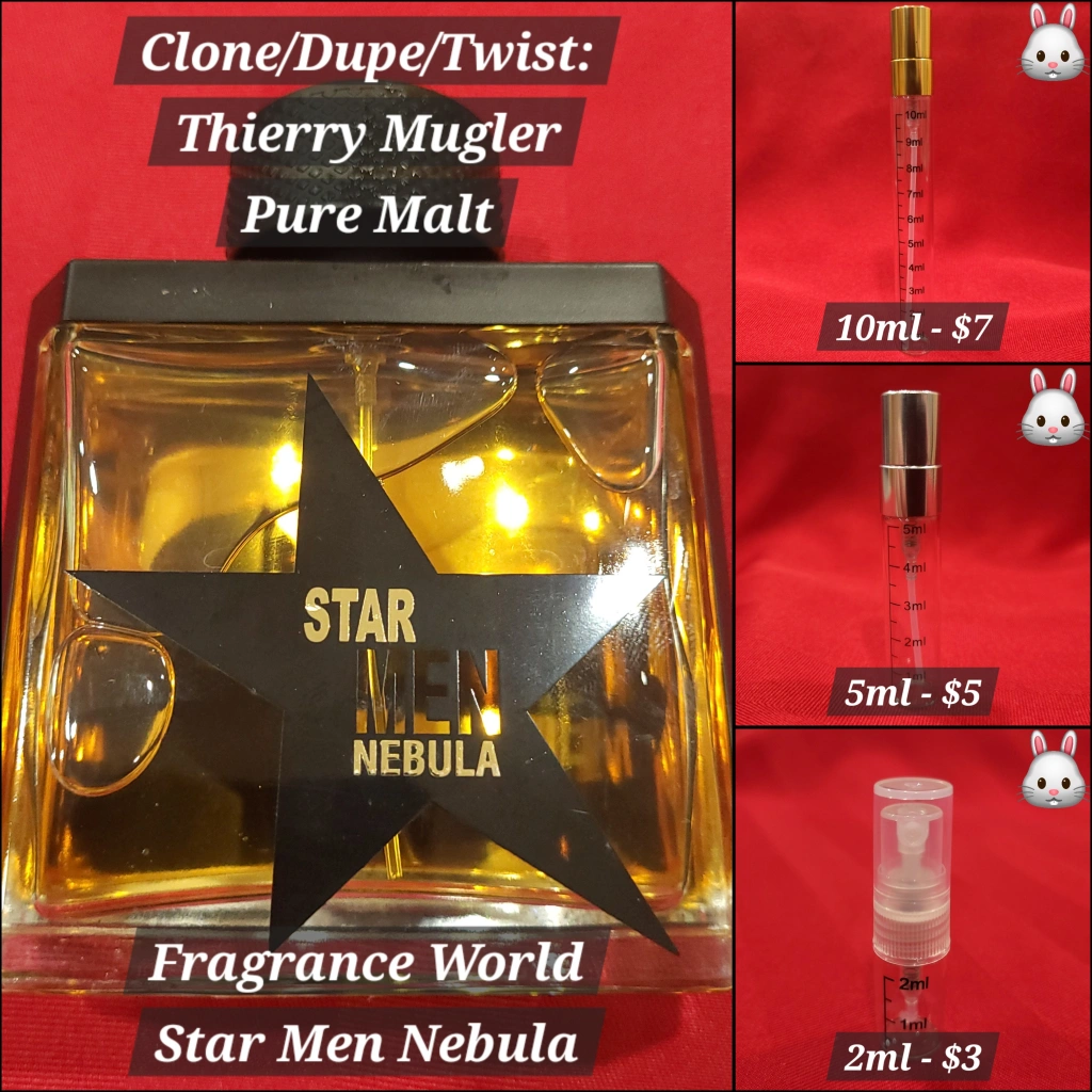 Clone/dupe/twist of Thierry Mugler Pure Malt. Available in 2ml, 5ml, and 10ml sizes. Star Men Nebula fragrance.
