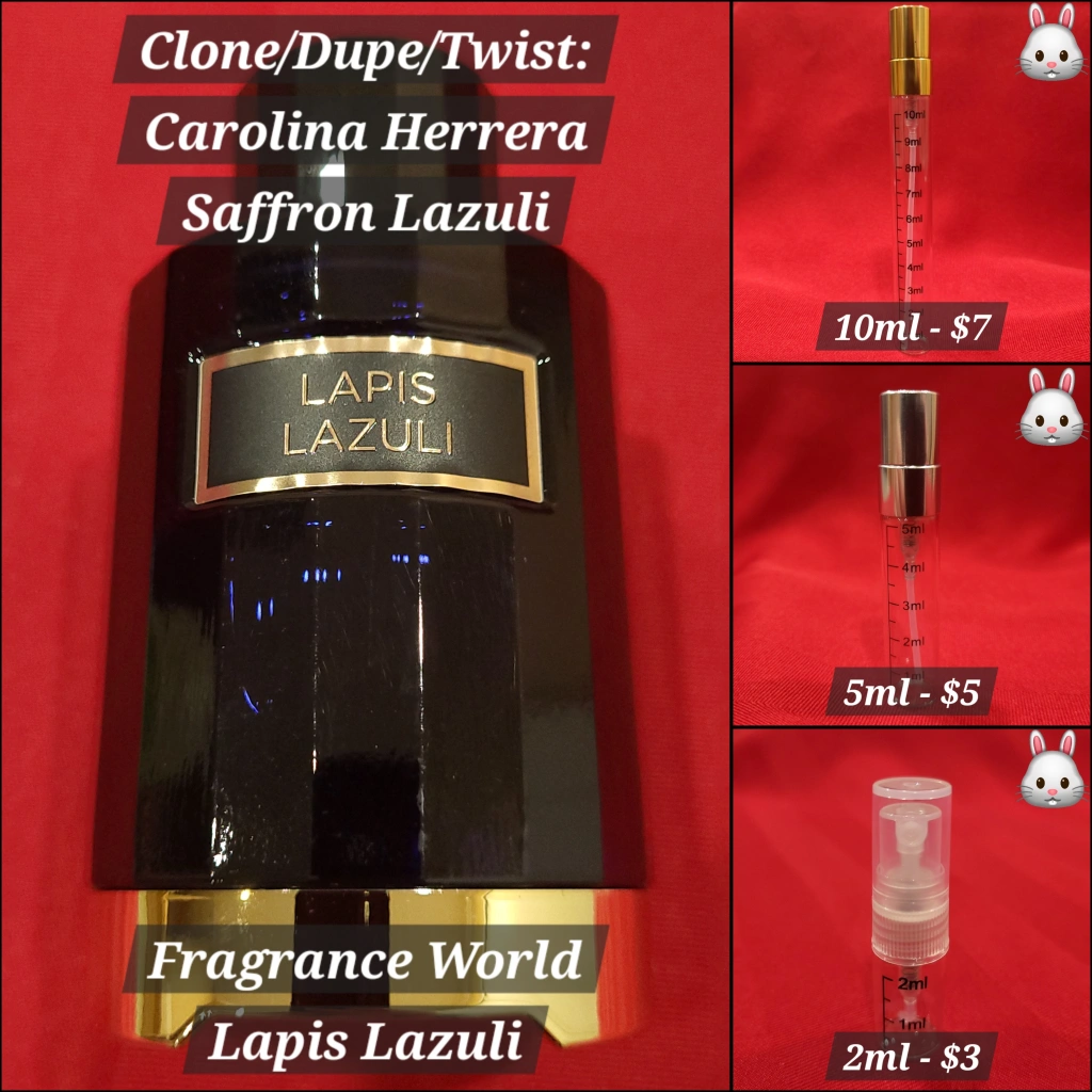 10ml, 5ml and 2ml decants available. Clone/Dupe of Carolina Herrera Saffron Lazuli. Price varies by size.