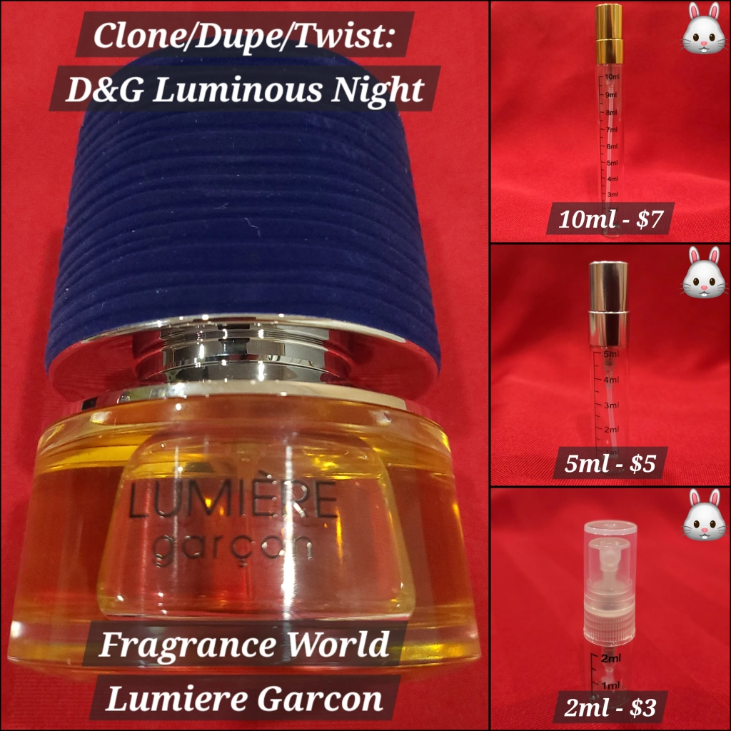 Fragrance World Lumiere Garcon, a clone of D&G Luminous Night. Available in 2ml, 5ml, and 10ml sizes.