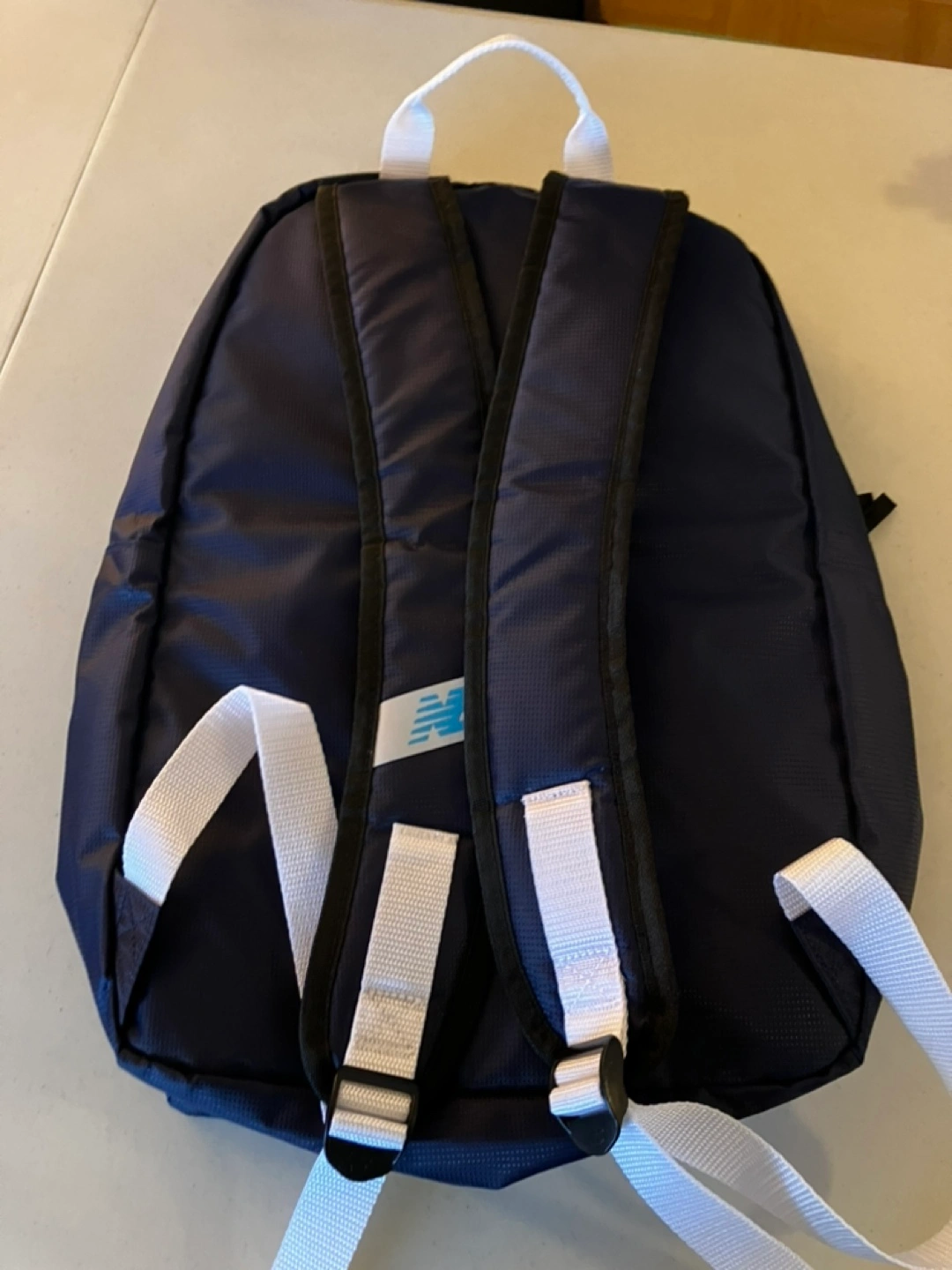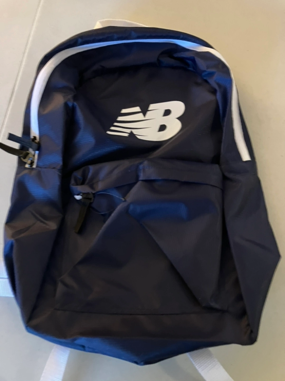 Regular size navy blue backpack. Features white accents and New Balance logo. Multiple compartments. Adjustable straps.