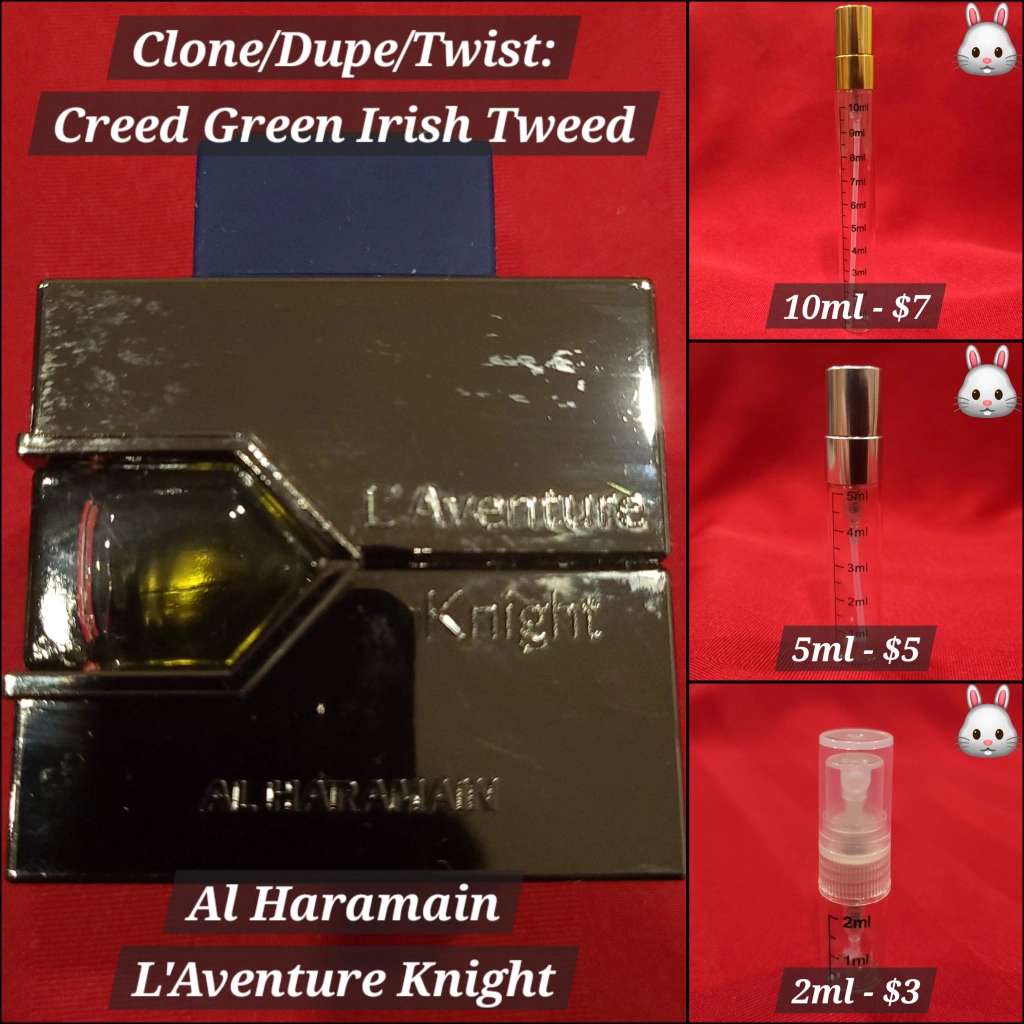 Al Haramain L'Aventure Knight perfume, a Creed Green Irish Tweed clone. Various sizes available: 2ml, 5ml, and 10ml. Prices vary.