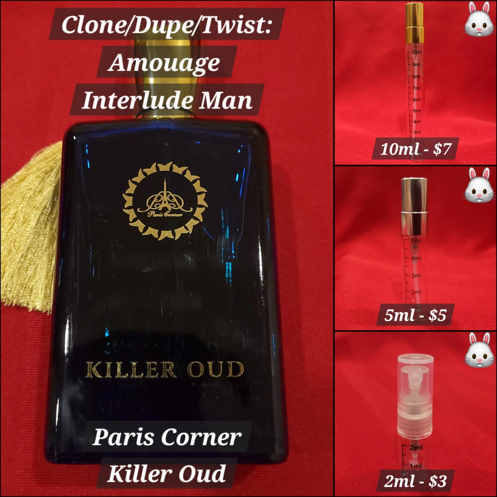 Decant of Paris Corner Killer Oud, a clone of Amouage Interlude Man. Available in 2ml, 5ml, and 10ml sizes. Dark blue bottle with gold accents. Gold tassel.