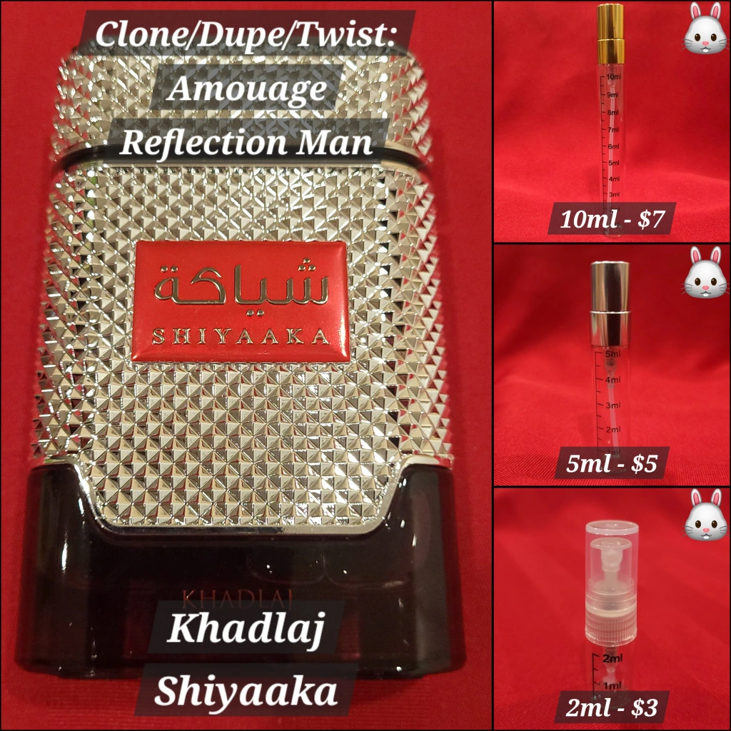 Amouage Reflection Man clone. Available in 2ml, 5ml, and 10ml sizes. Silver and black bottle. Studded design.