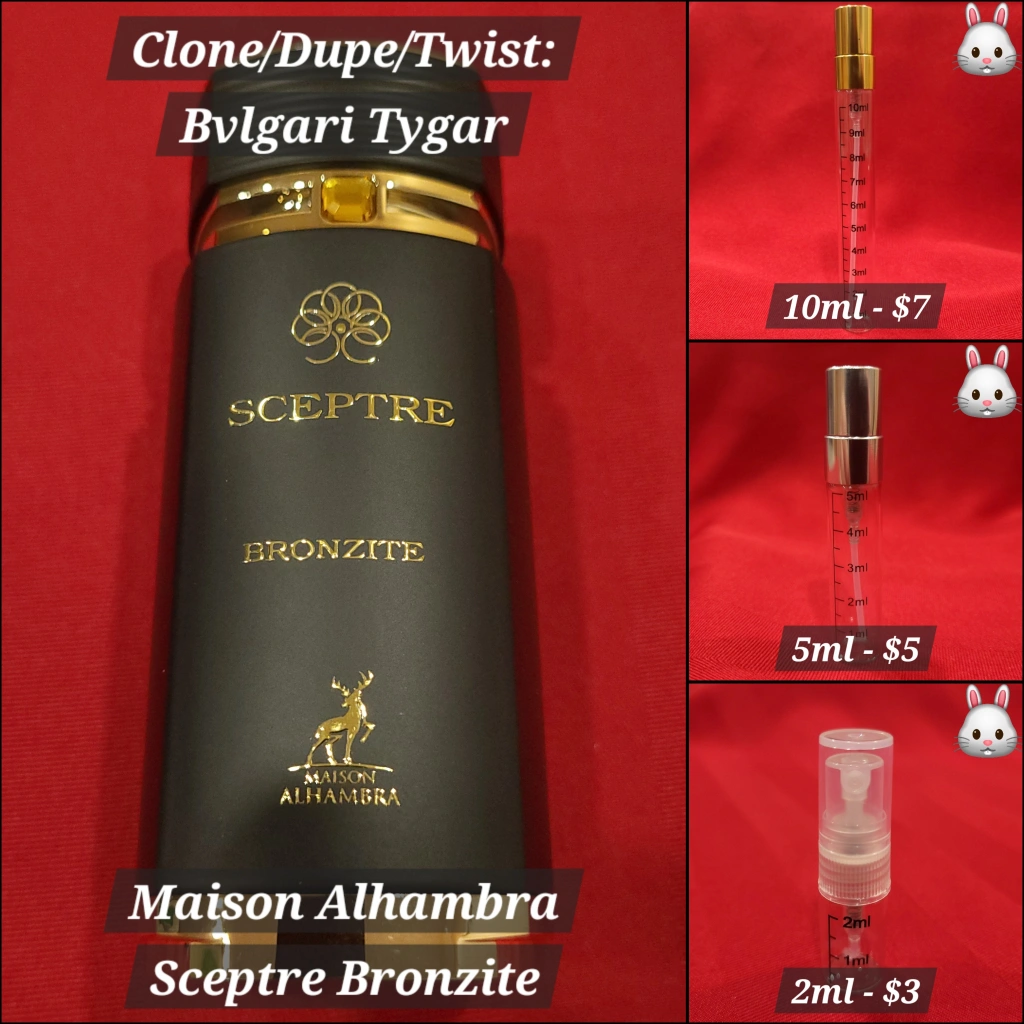Maison Alhambra Sceptre Bronzite perfume, inspired by Bvlgari Tygar. Available in 2ml, 5ml, and 10ml sizes. Dark bottle with gold accents. Discreet deer logo.