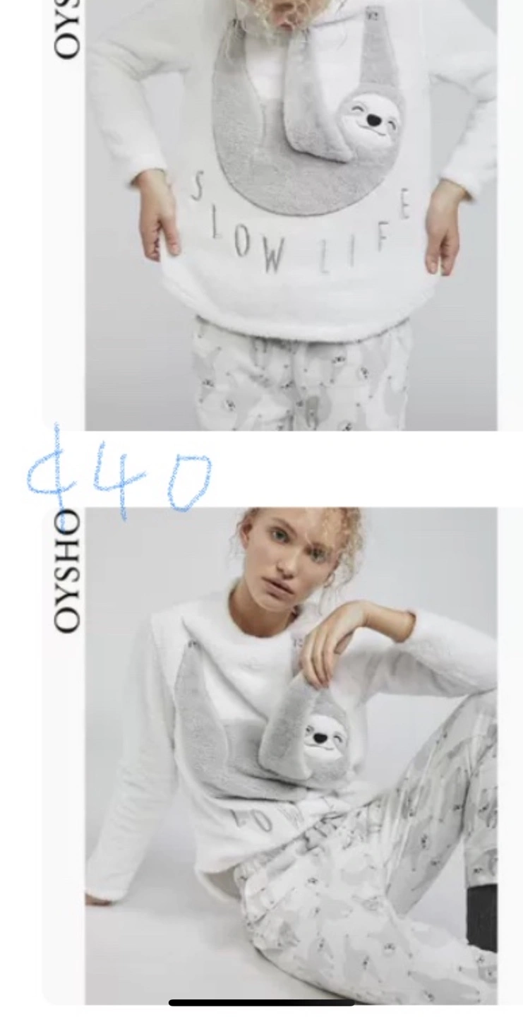 Cozy white loungewear set. Features a sloth applique and "Slow Life" text. Matching pants with sloth print. Perfect for relaxing.