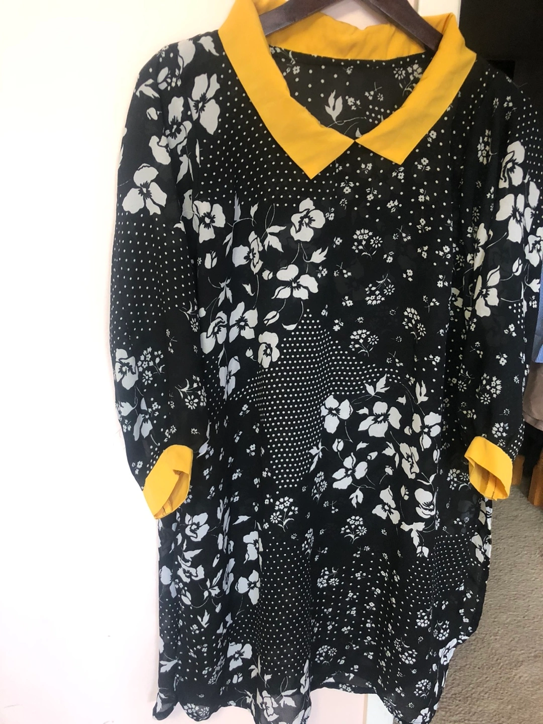 Women's shirt Features a black and white floral print, mustard yellow collar and cuffs. Three-quarter sleeves. Relaxed fit.