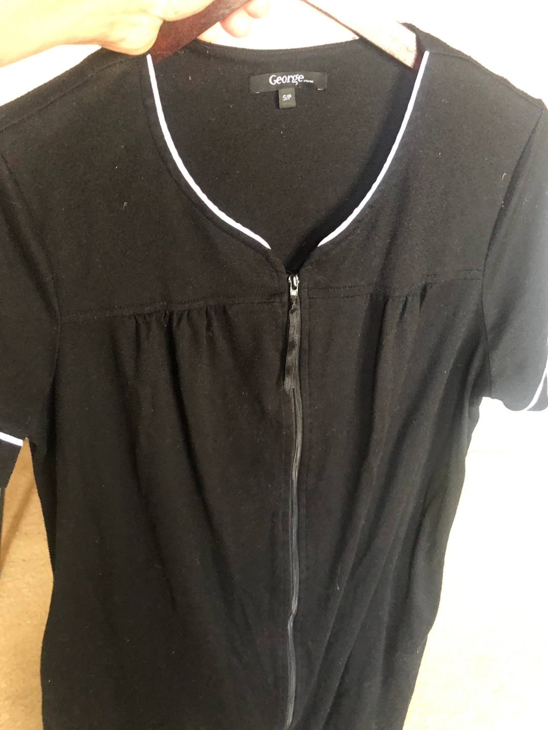 Black sleepshirt. Short sleeves. Full-length zipper. White piping detail. Size small/petite.