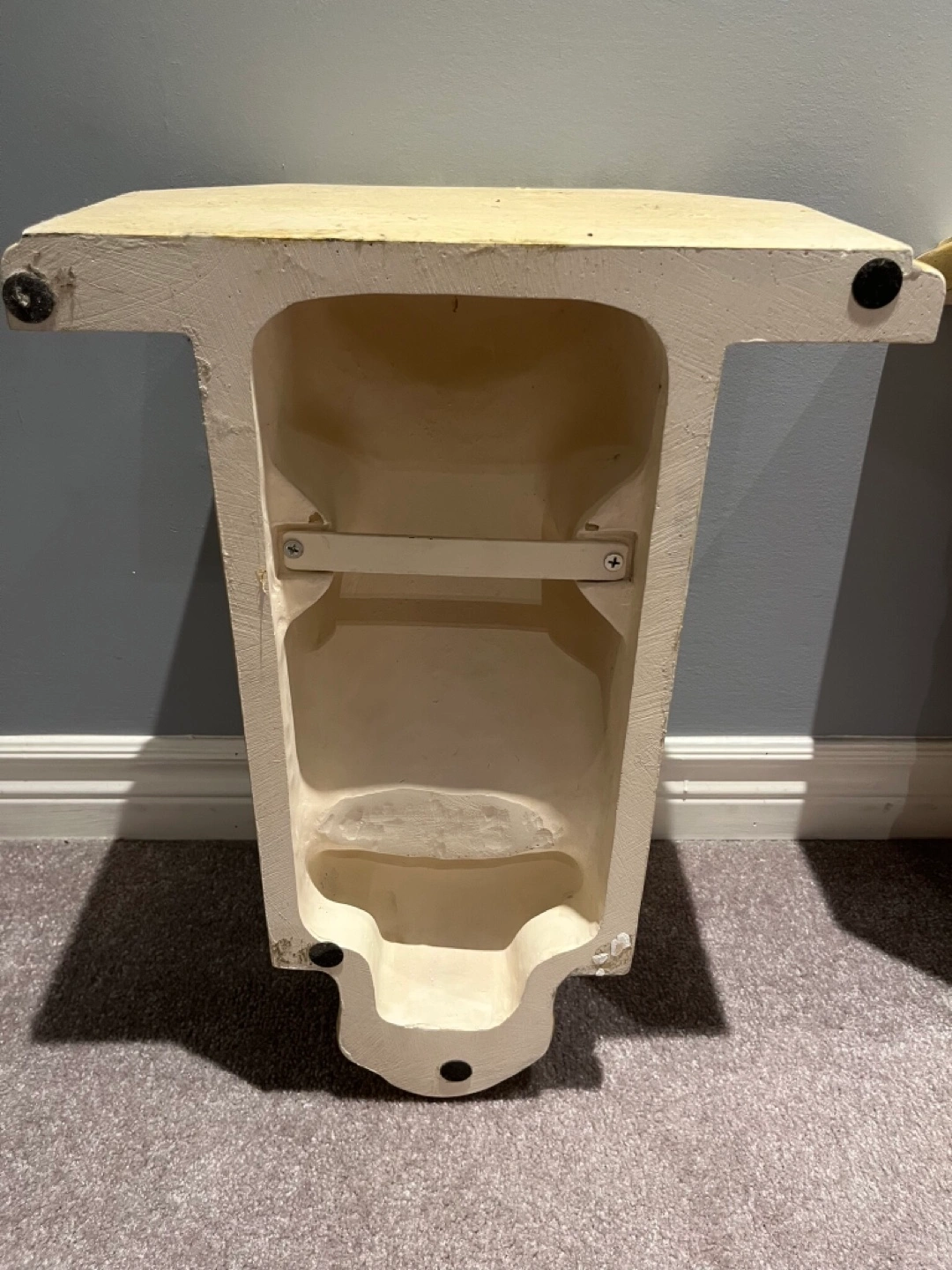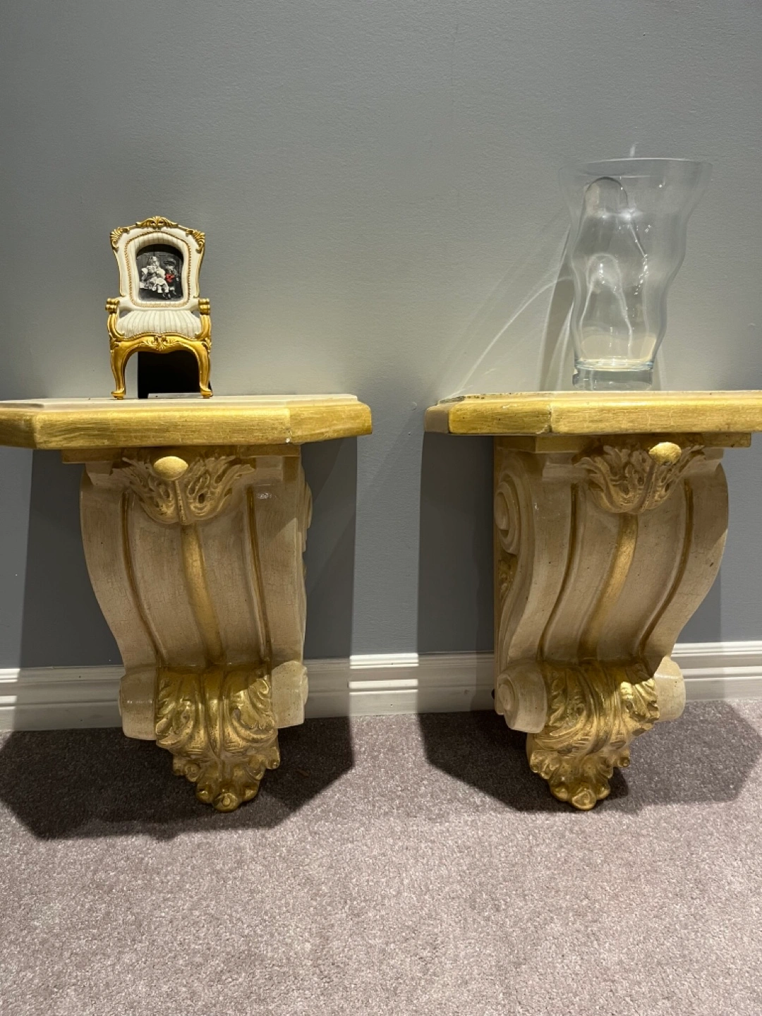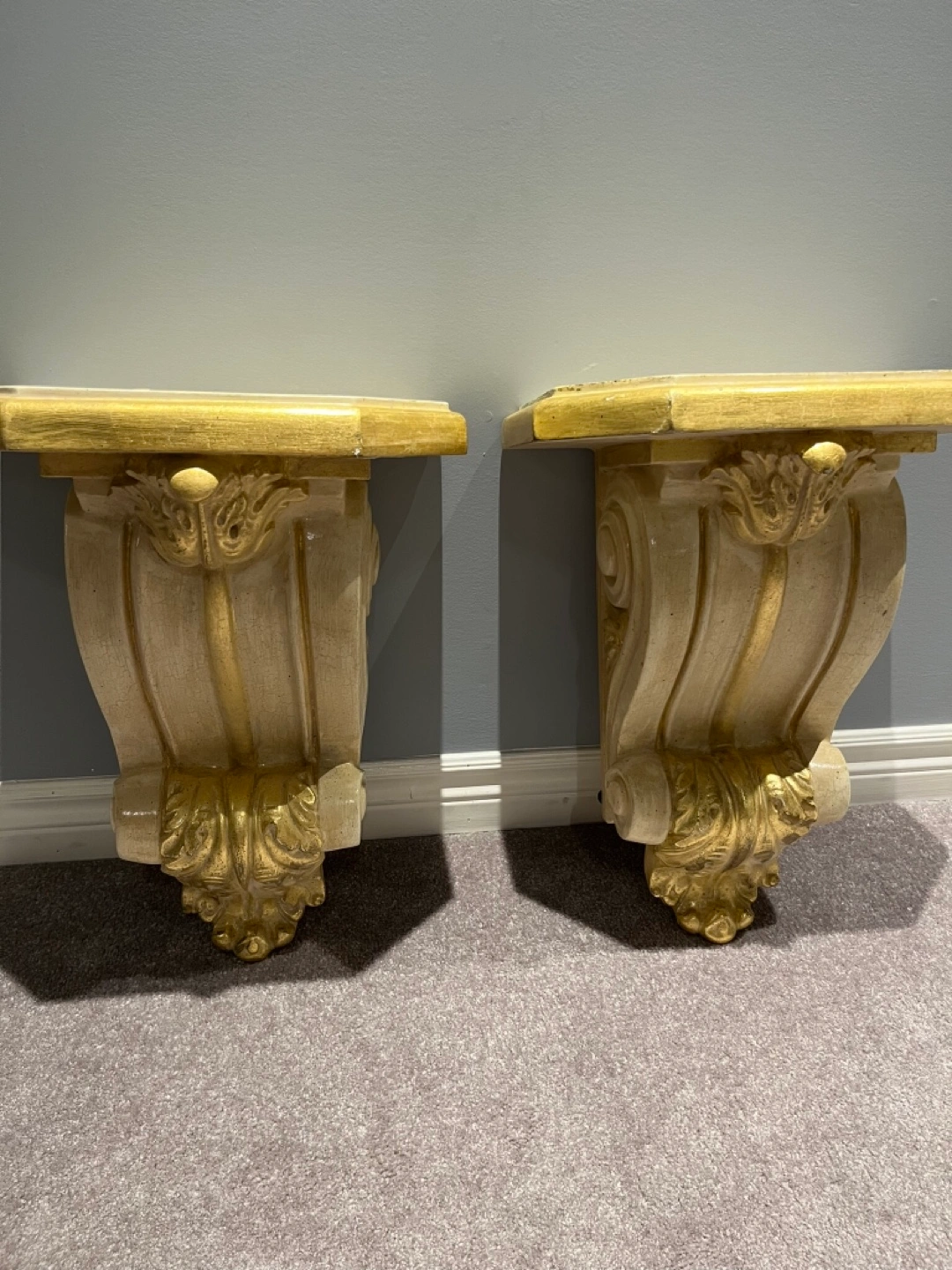 Elegant wall-mounted shelves. Features an off-white and gold finish. Intricate detailing. Solid construction. Perfect for displaying decorative items. Cash only Price is firm Bathurst And Steeles Pick up
