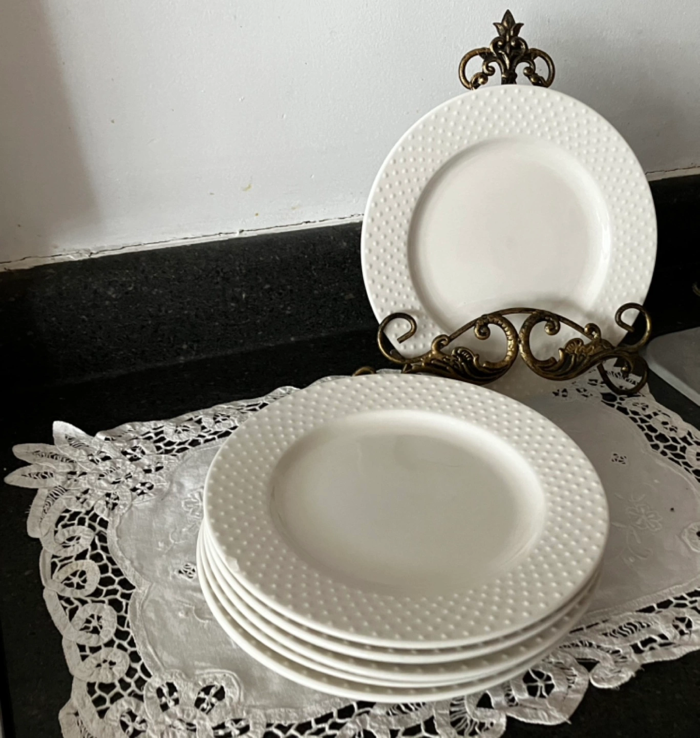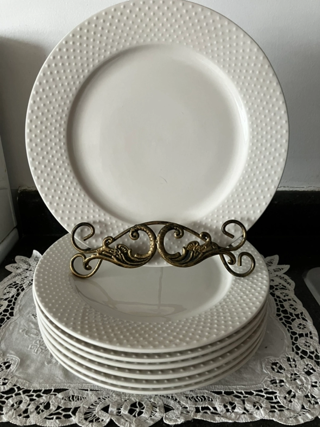 7 dinner plates, 5 soup larger plates and 6 salad plates. Elegant textured surface. Perfect for everyday use or special occasions. Sold as a set.