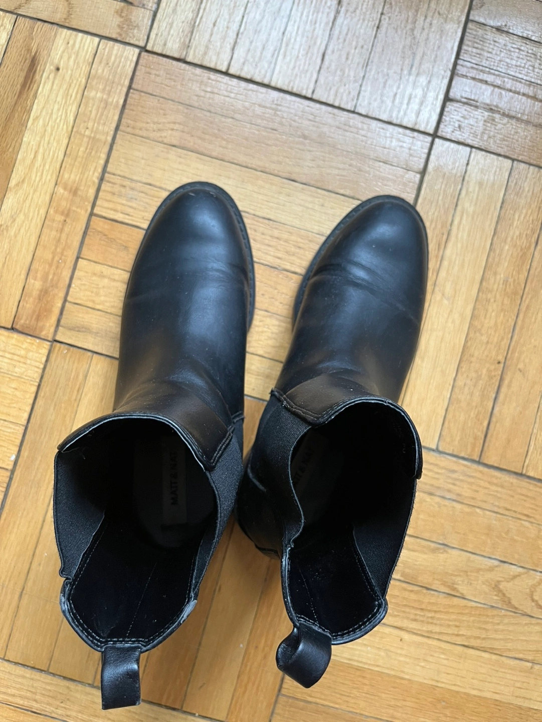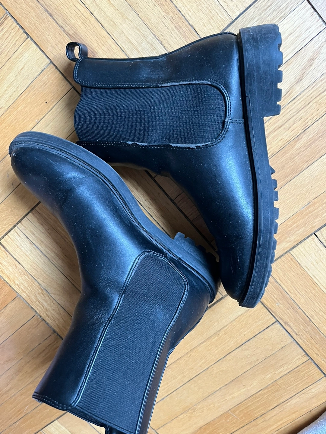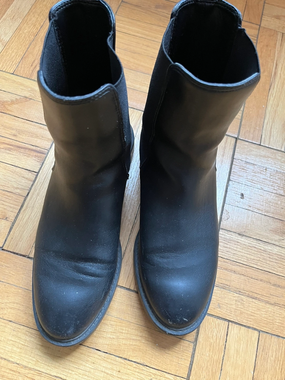Pair of black leather Chelsea boots. Elastic side panels. Slight wear visible on soles and sides. They are 37 euro which is size 6, but they fit like a 6.5 Used condition