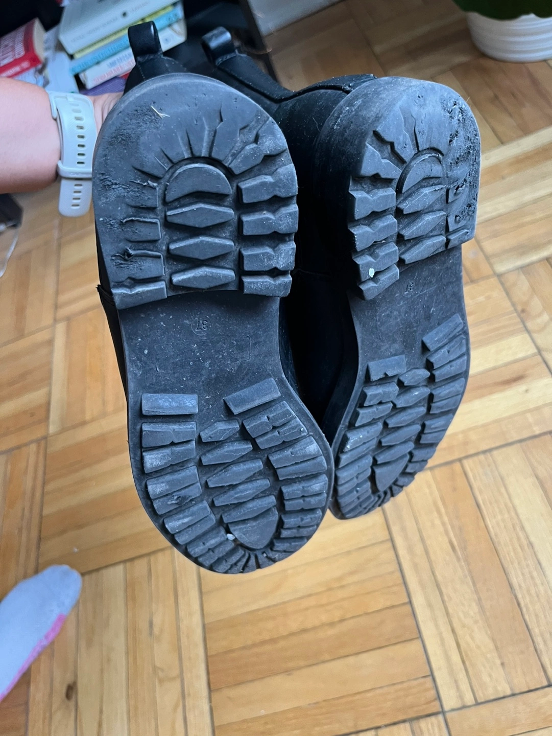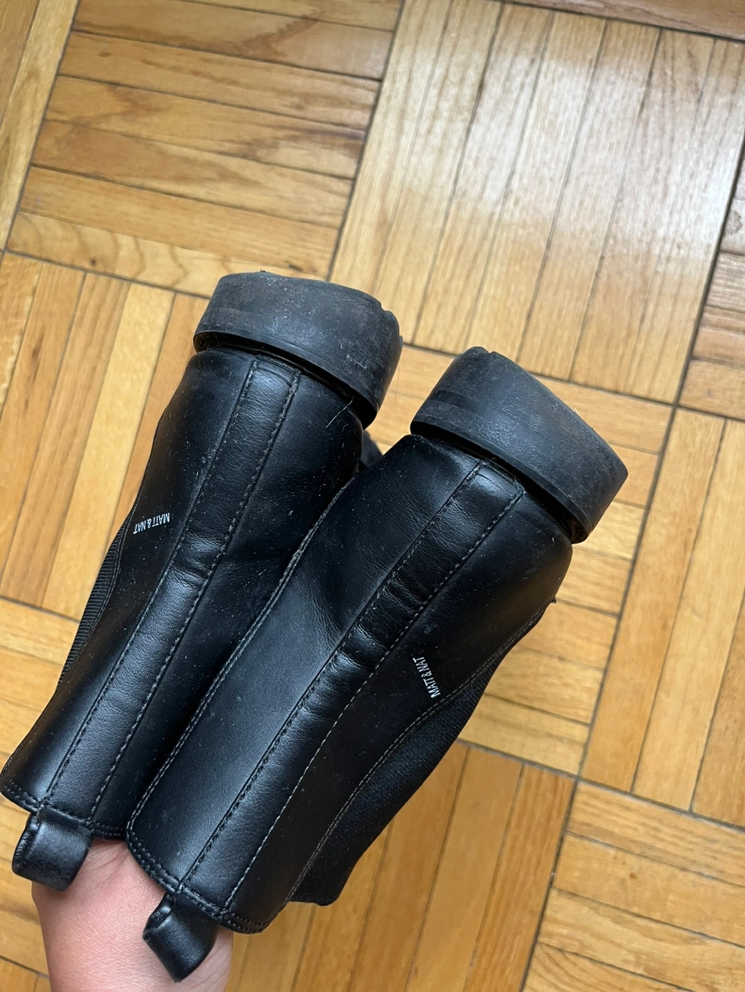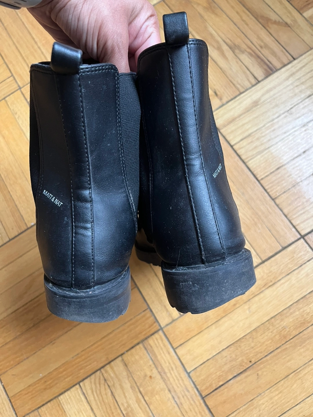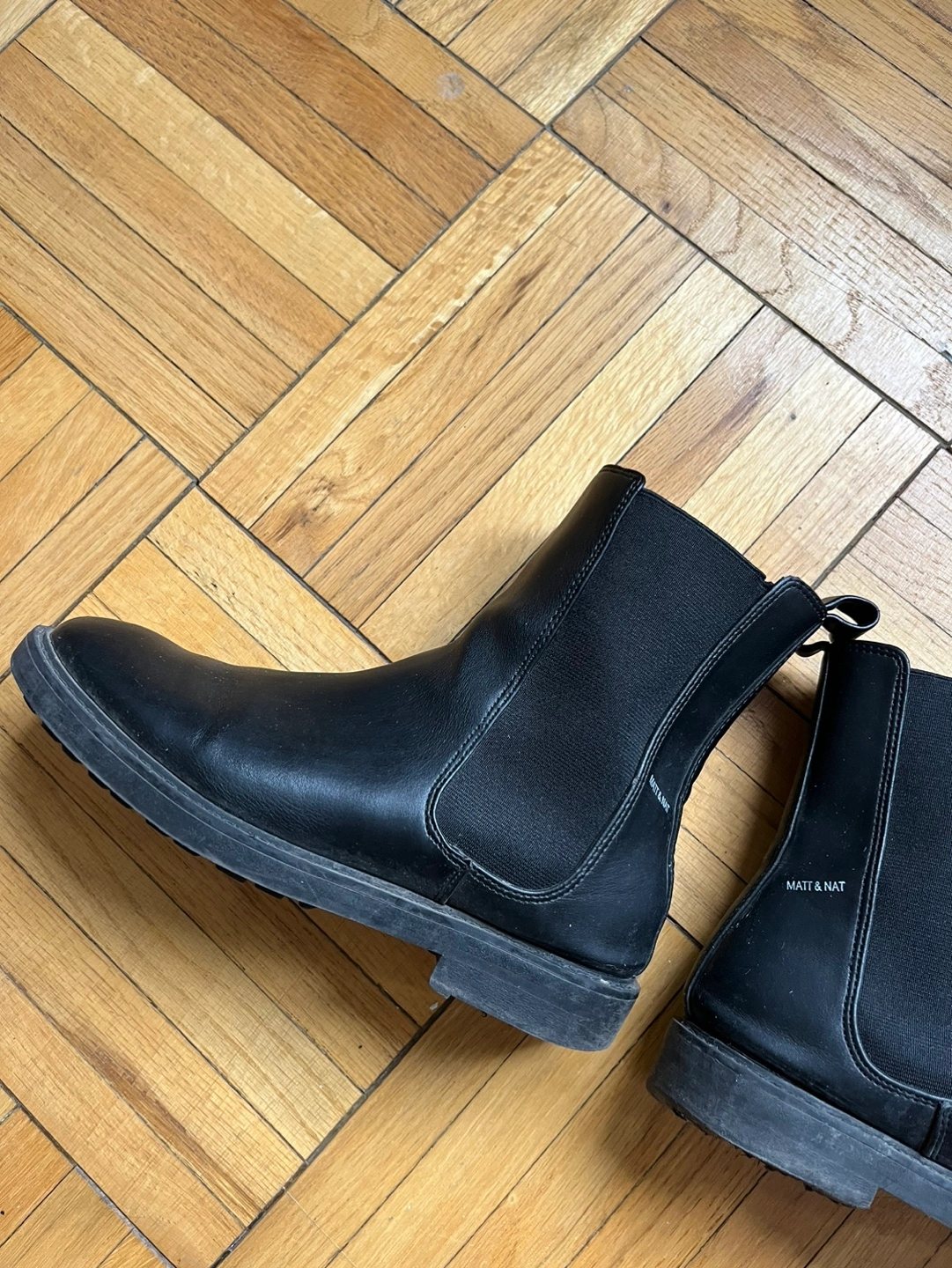 Pair of black leather Chelsea boots. Elastic side panels. Slight wear visible on soles and sides. They are 37 euro which is size 6, but they fit like a 6.5 Used condition