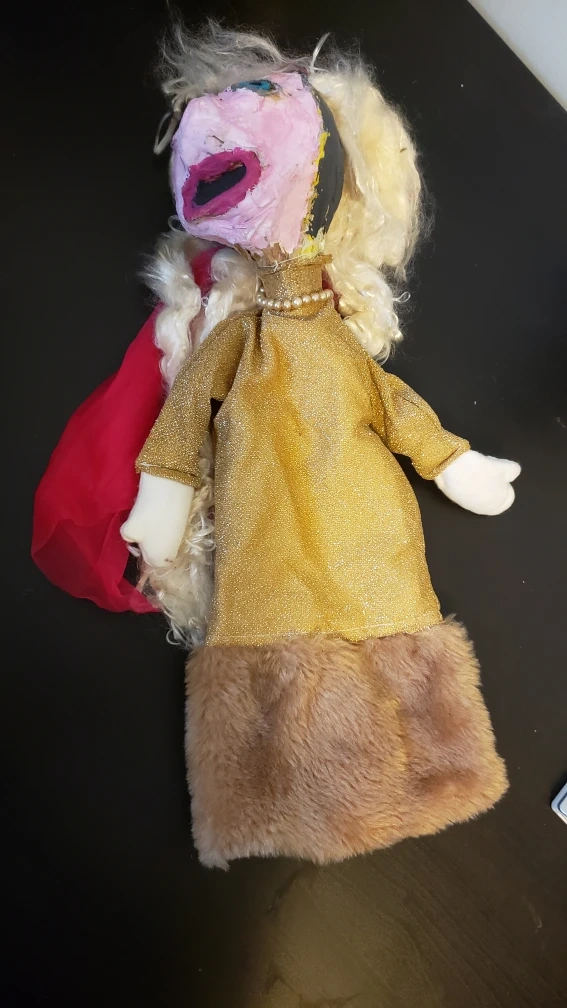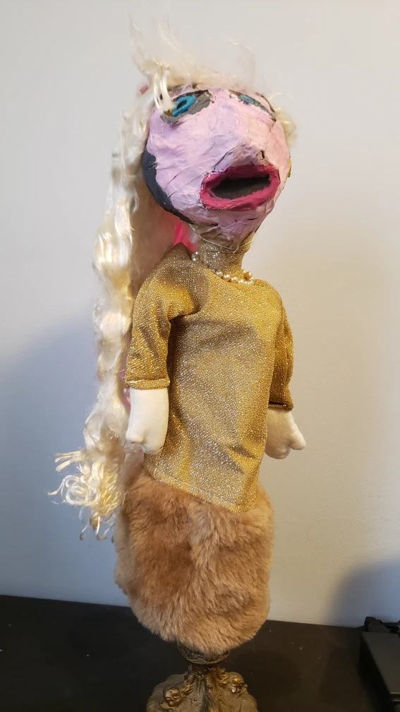 Vintage hand puppet. Features white long locks, gold dress, and brown fur trim. Pink blushing face Unique design. Excellent for collectors or puppet shows.