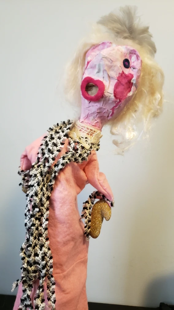 One-of-a-kind handmade puppet. Features a pink dress, whitr hair, and a textured face. Gold-toned accents on the hands. Black and white scarf accessory. Intriguing and expressive design. feather in hair check out others that are also posted