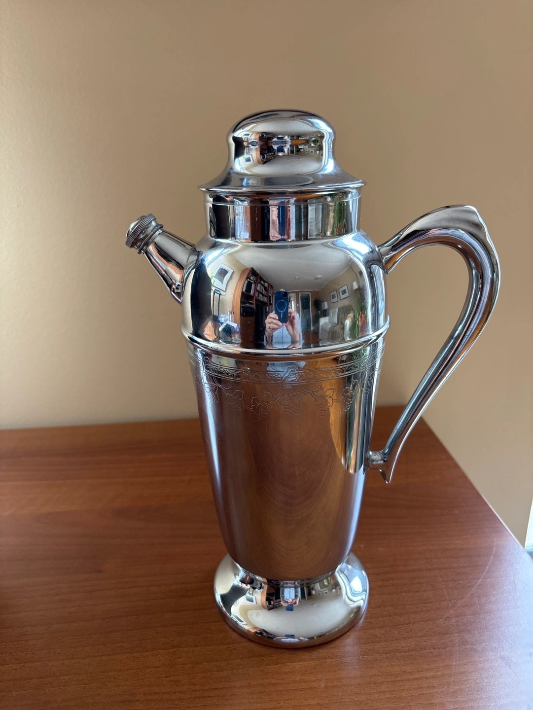 Beautiful vintage wine decanter chrome-plated metal, 12 inches tall. Featuring an engraved grape motif along the circumference. In perfect condition without any scratches or dings. Included are also a lid and a separate screw-on cap. An elegant addition to any bar. From a pet and smoke free home. Cash only. Pickup is in the St. Lawrence market area of downtown Toronto.