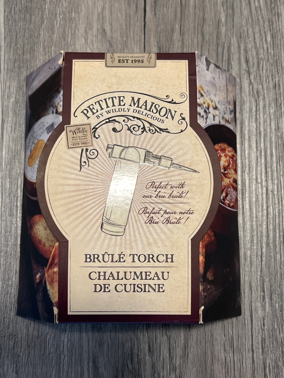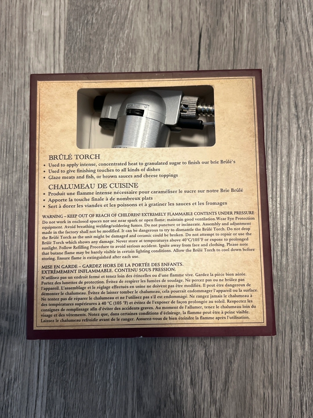 New in box kitchen brulee torch. Perfect for creme brulee and other dishes. Includes instructions. Metal body.