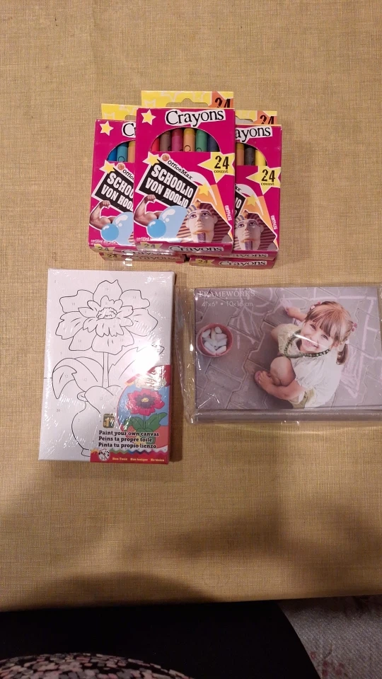 Three boxes of OfficeMax School Von Hoolio crayons, one paint-your-own canvas, and one Frameworks 4x6 photo frame. All items are new or unused.