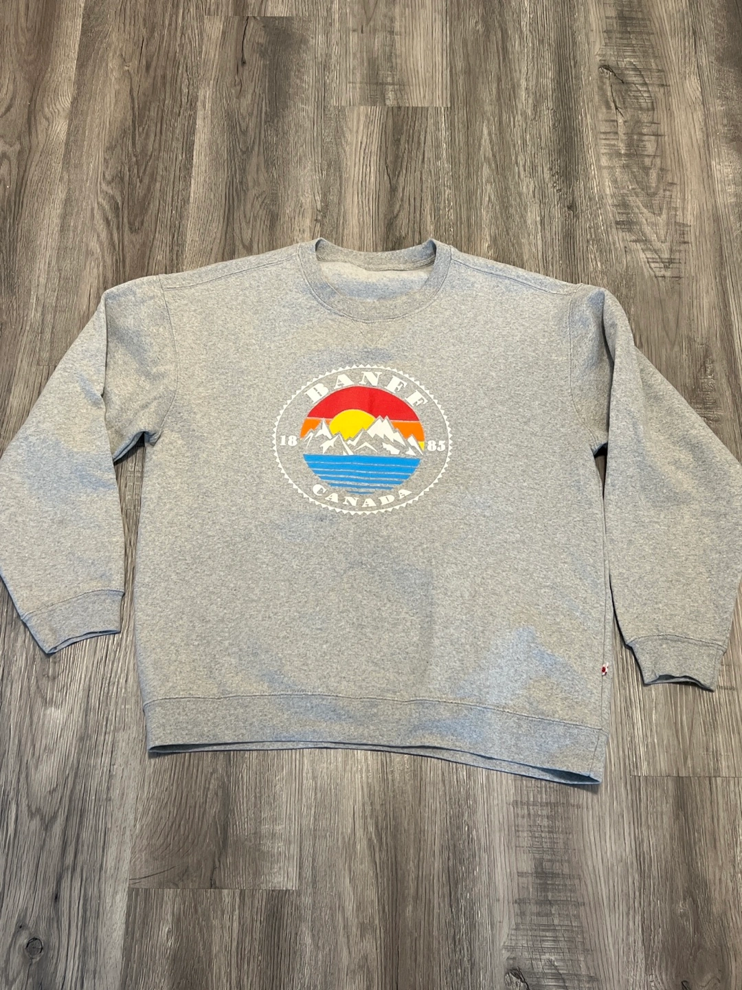 Grey crewneck sweatshirt. Features a circular Banff, Canada graphic. Long sleeves, relaxed fit.