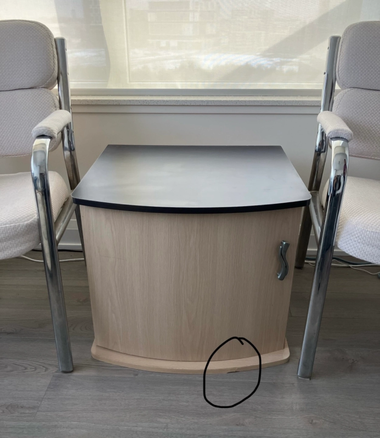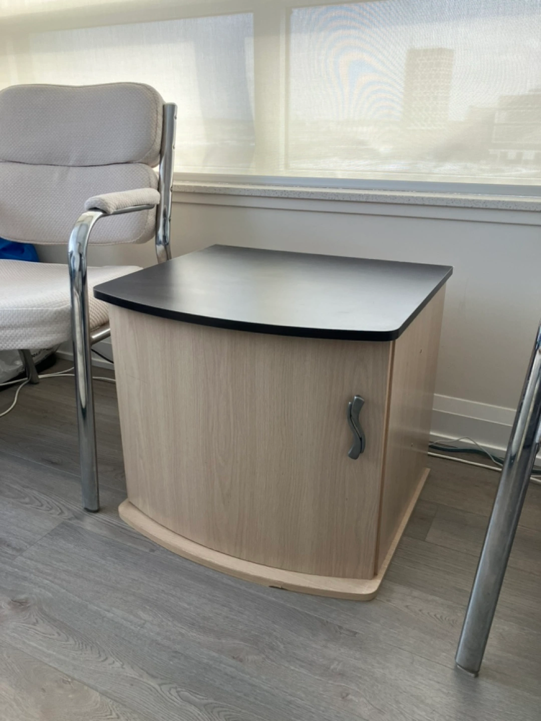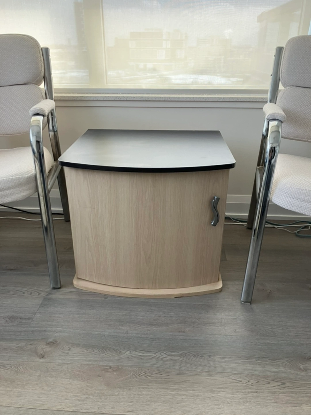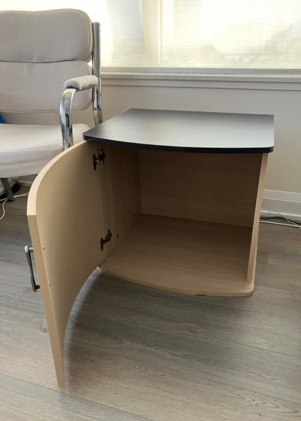 Compact storage cabinet. Features a curved top and single door. Light wood finish with dark top. Perfect for small spaces / coffee table or nightstand , with large volume of storage . Small scuff mark on the bottom (see picture 5) *Please check Eric’s other listing * quality and bargain items might interest you. Thank you !