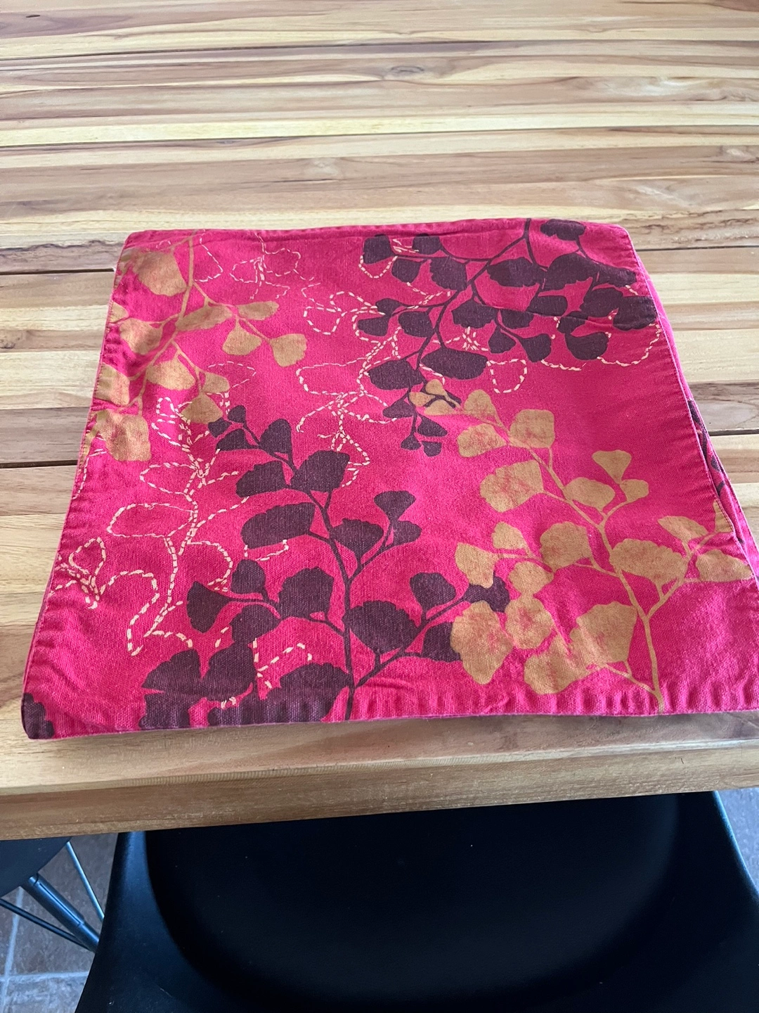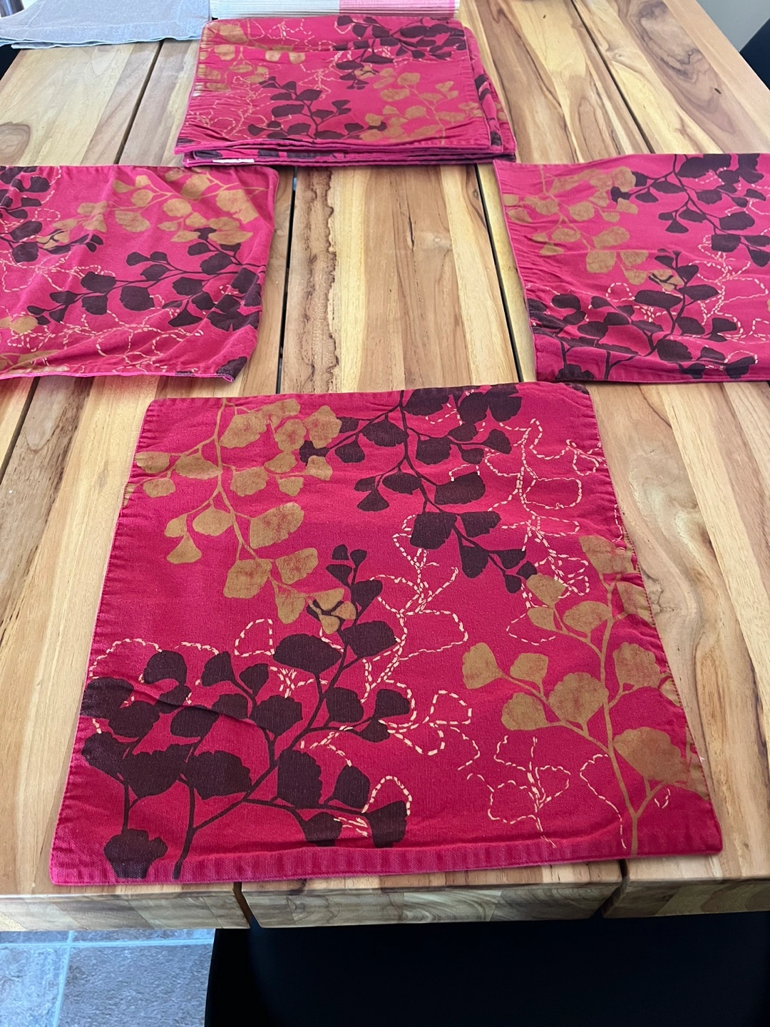 8 placemats. Red colour. Features a leaf pattern in brown and gold. Good condition. Perfect for adding a touch of elegance to your dining table.