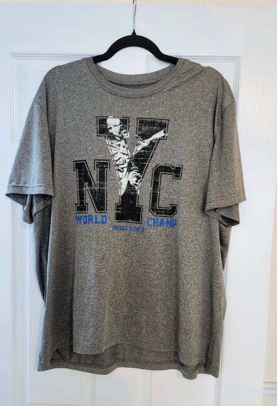 Grey heather men's t-shirt. Features a graphic of a baseball player forming the letter "Y" in "NYC". Text includes "World Champ" and "Empire State". Short sleeves, crew neck.