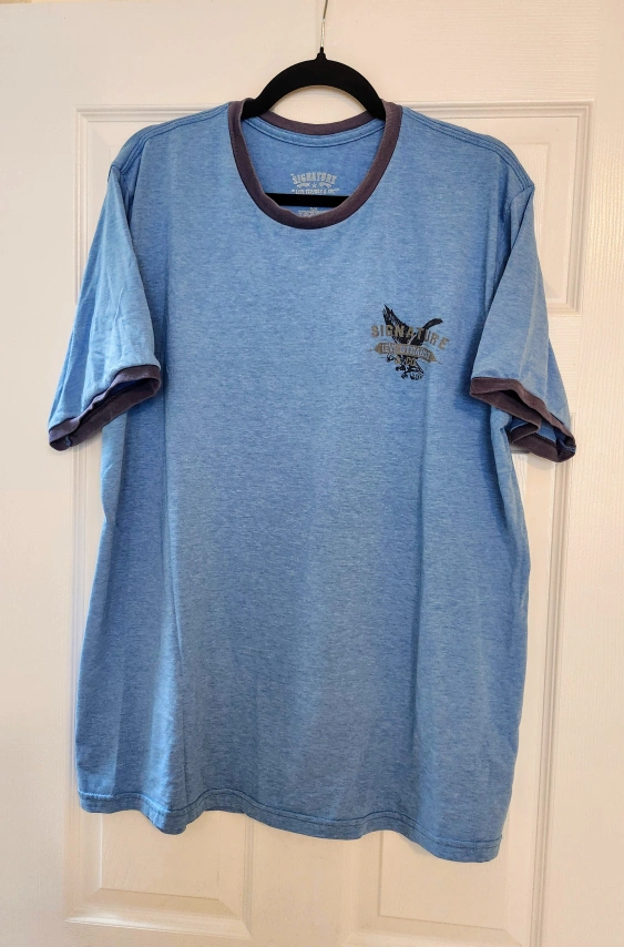 Men's blue t-shirt. Features a ringer neckline and eagle graphic. Lightweight fabric.