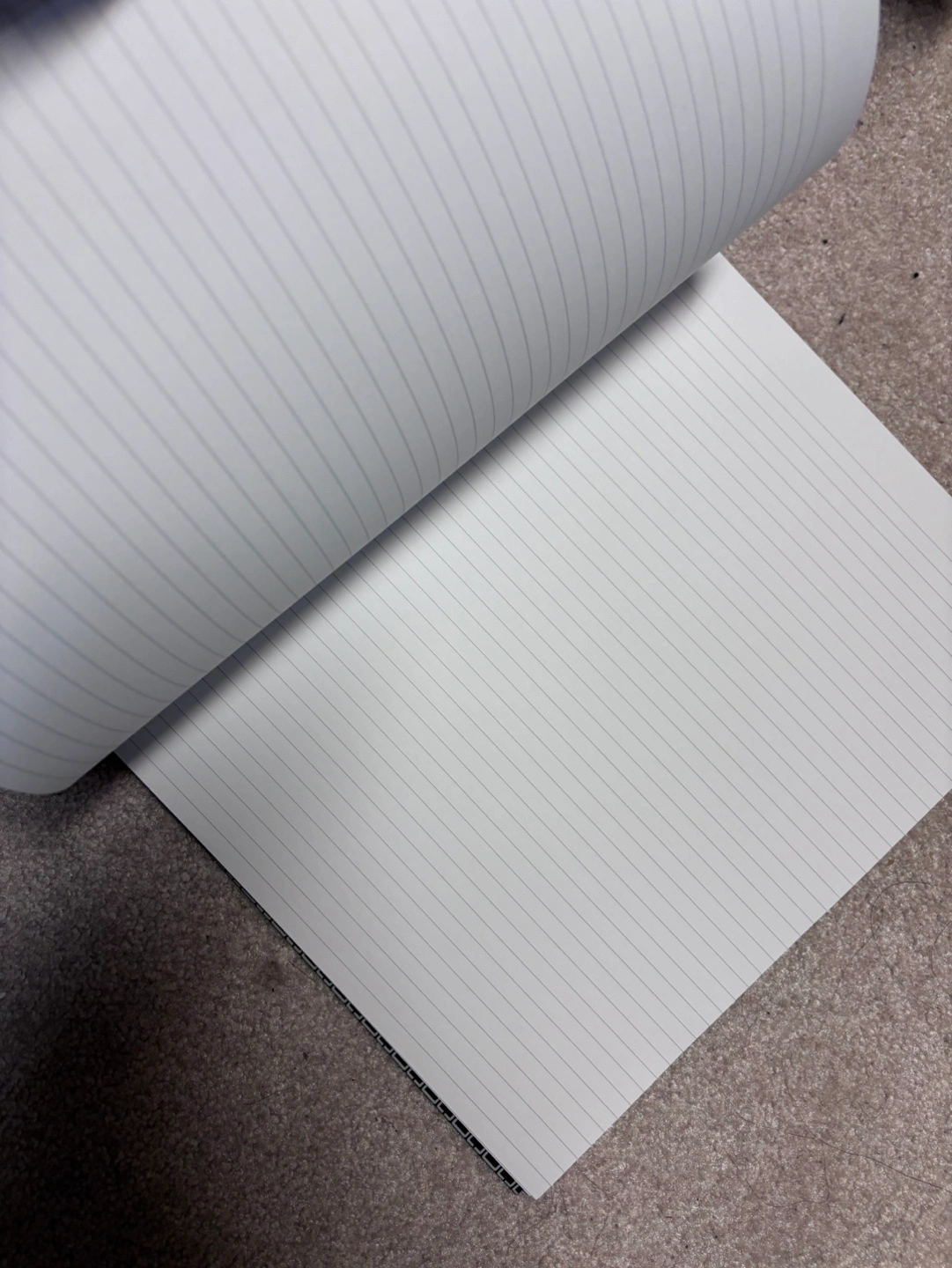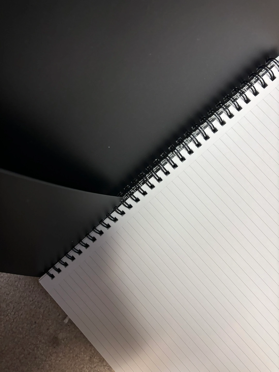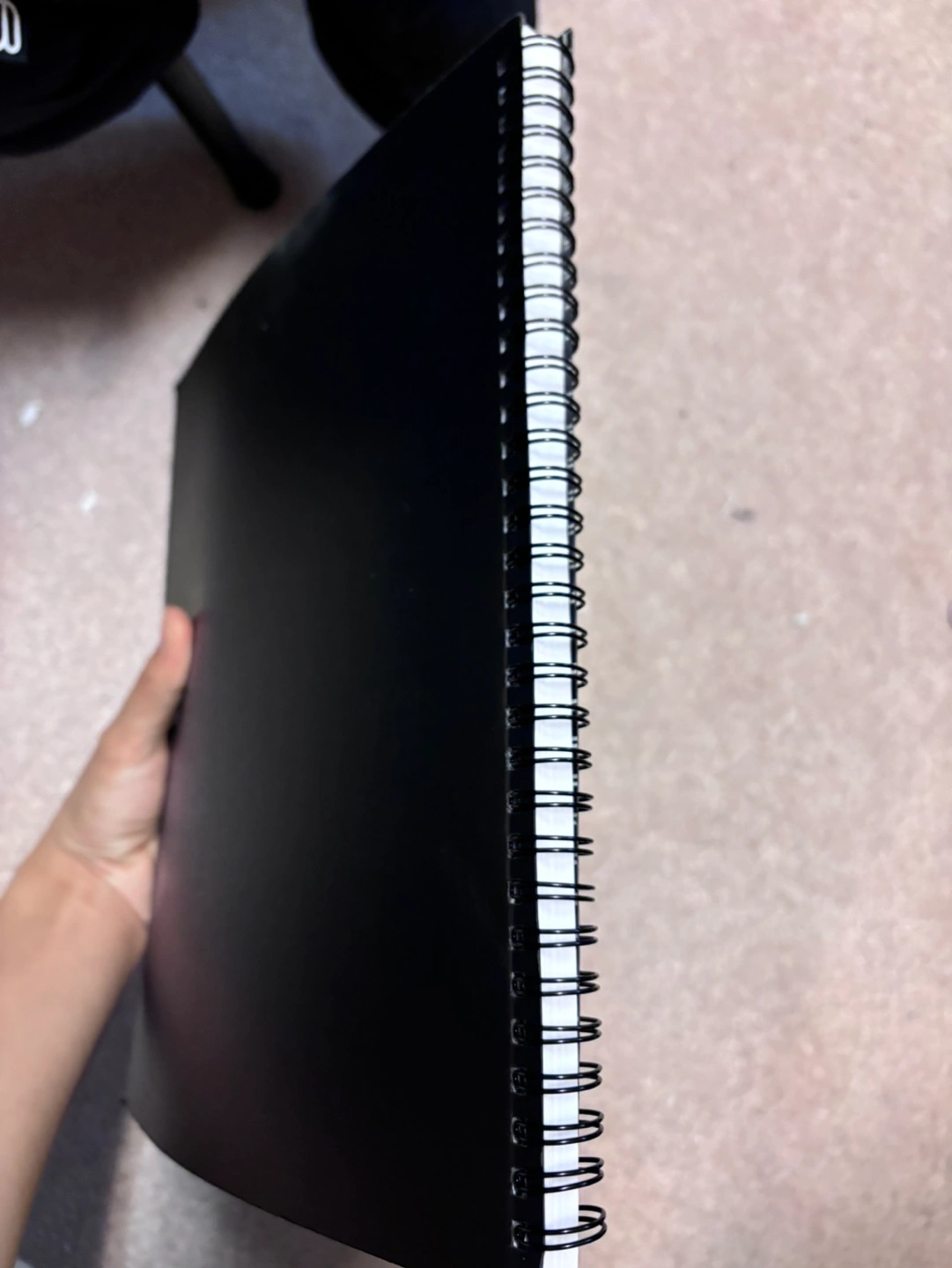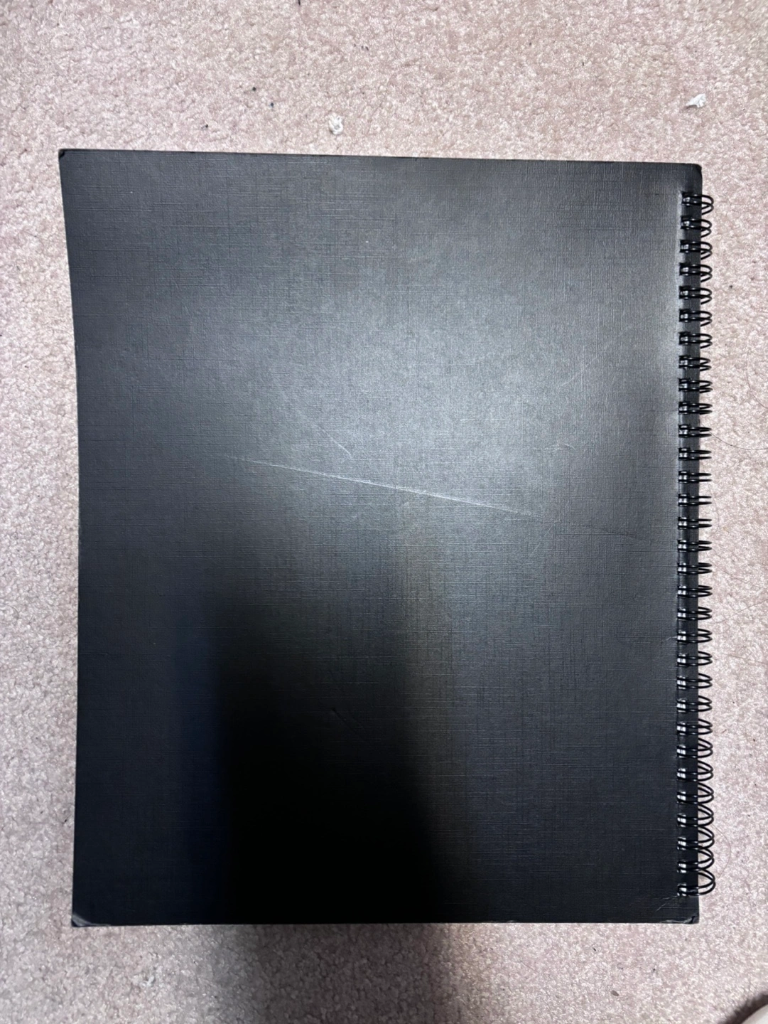 Unused large spiral-bound notebook. Black cover, lined paper. Perfect for note-taking or sketching.