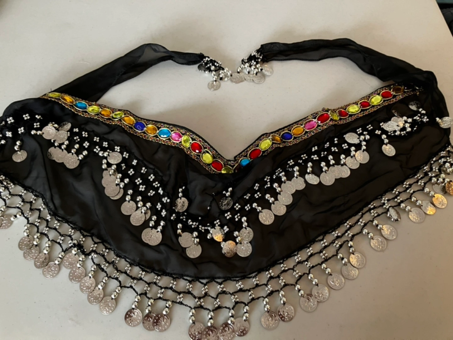 Beautiful black chiffon belly dance hip scarf. Features silver coin accents and colourful jewel embellishments. Great for performances or practice.