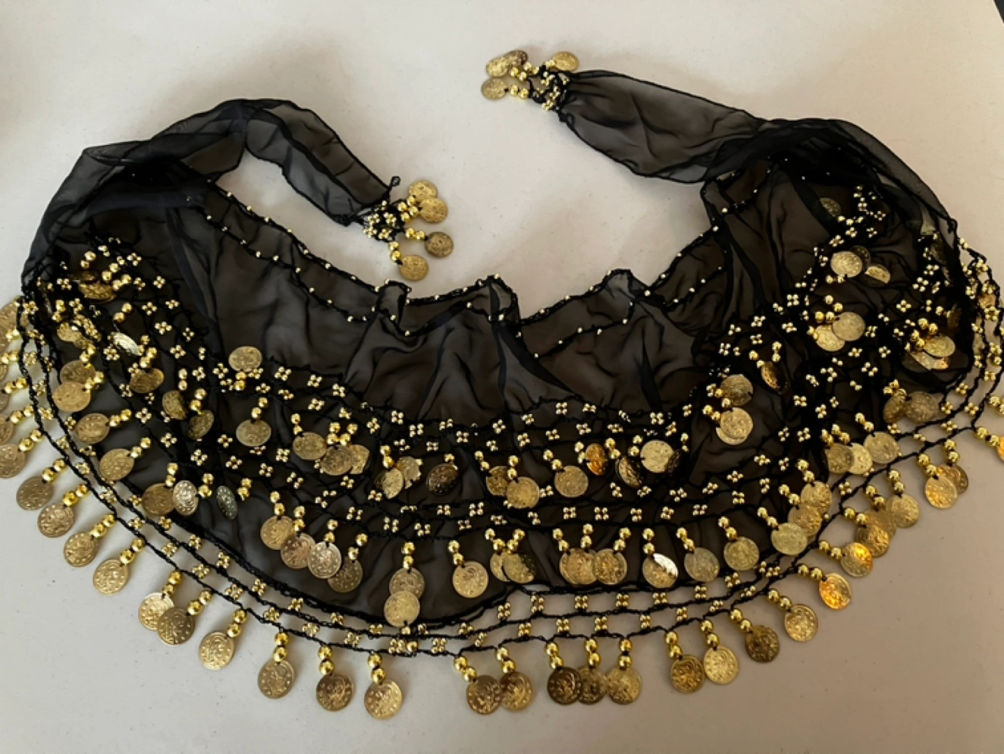 Beautiful black sheer hip scarf. Adorned with gold coins and beads. Great for belly dancing or costume.