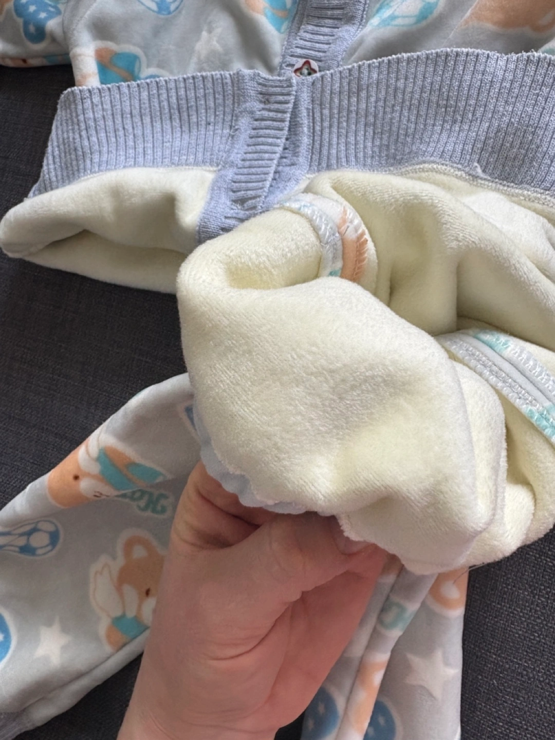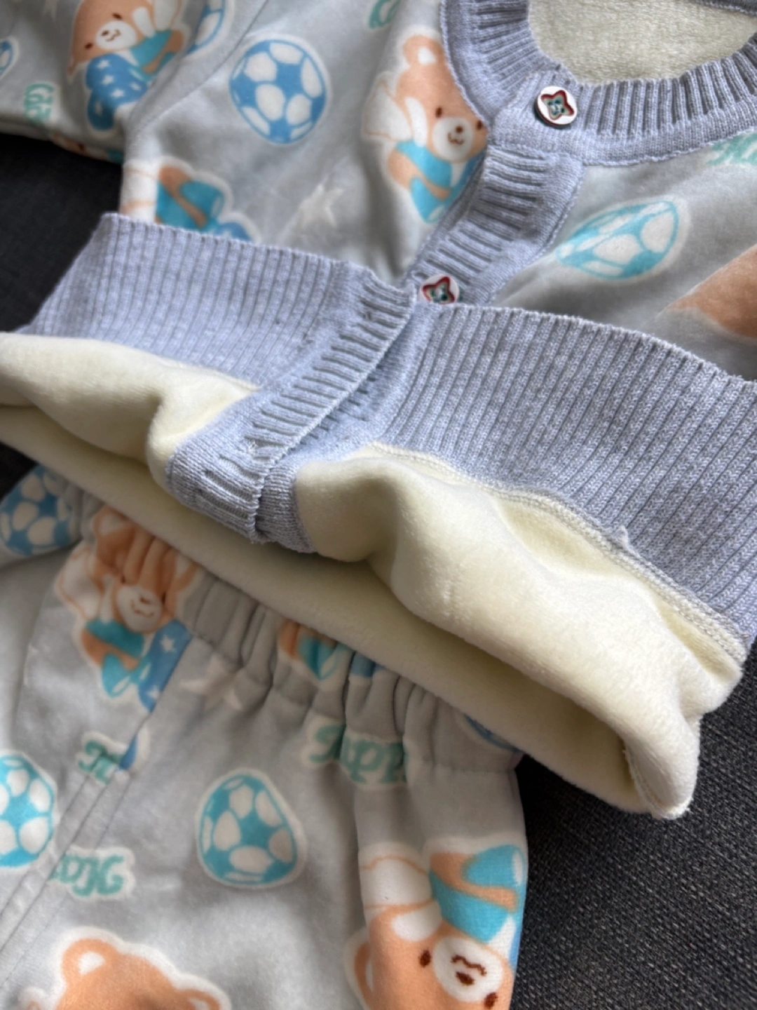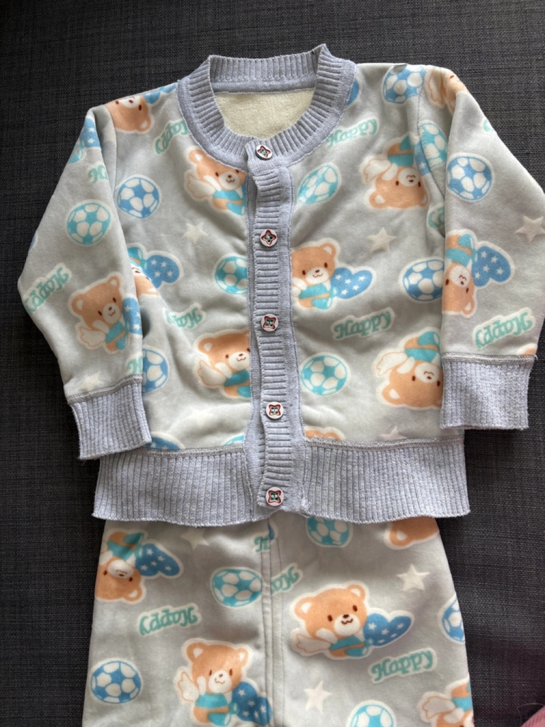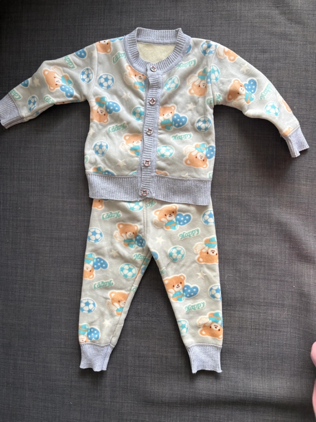 Adorable baby boy's two-piece outfit. Features a grey fleece cardigan and matching pants. Cute bear and soccer ball print. Soft, warm, and cozy. Button closure on the cardigan. Great for cooler weather. Good for 1-2 year old Gently used