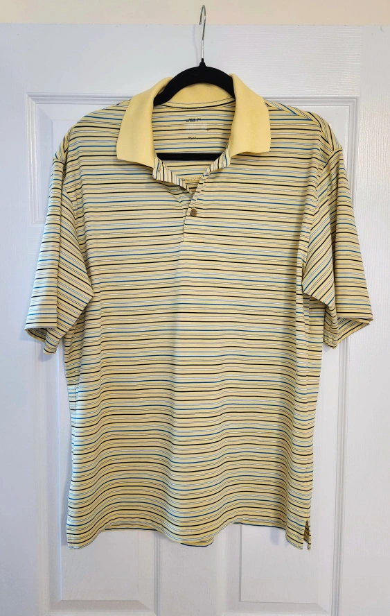 Pale yellow horizontally striped men's polo shirt. Short sleeves, collared, button closure. Size Large.