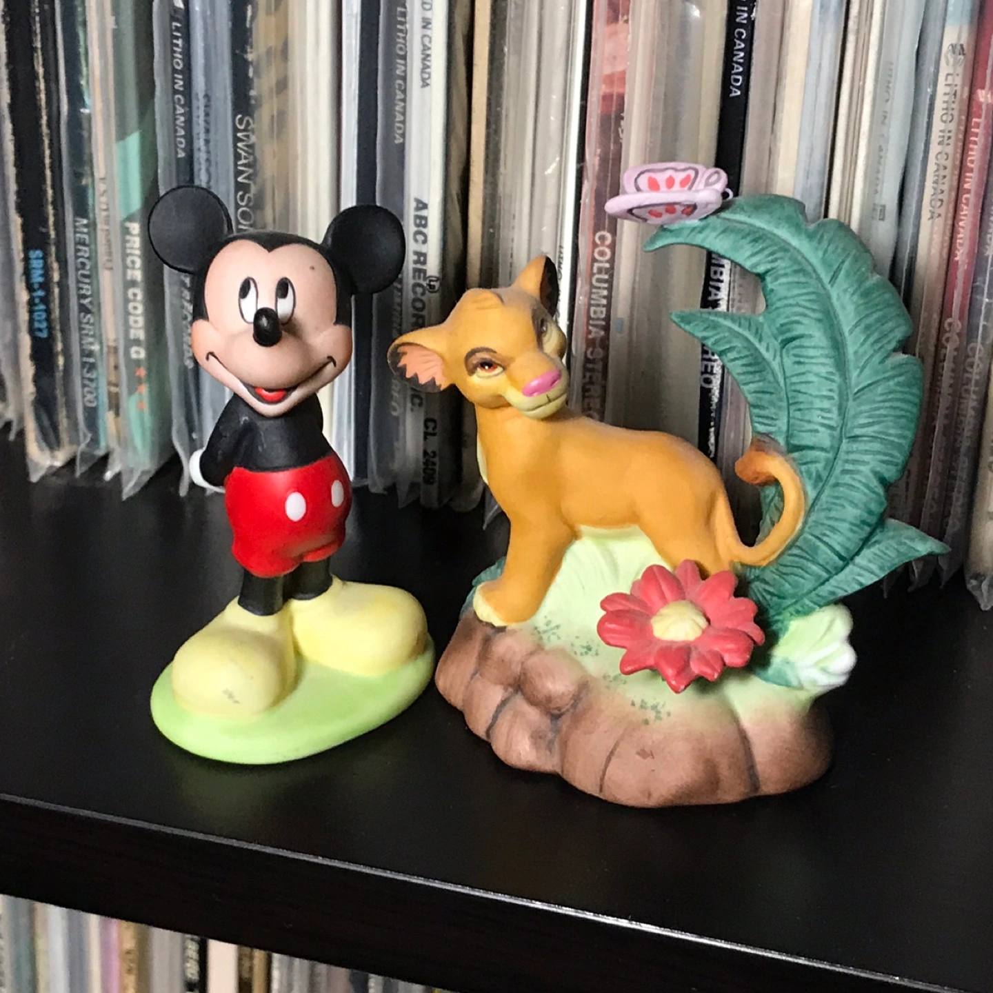 Vintage pair of ceramic figurines. Features Mickey Mouse and Simba from The Lion King. Collectible Disney characters.